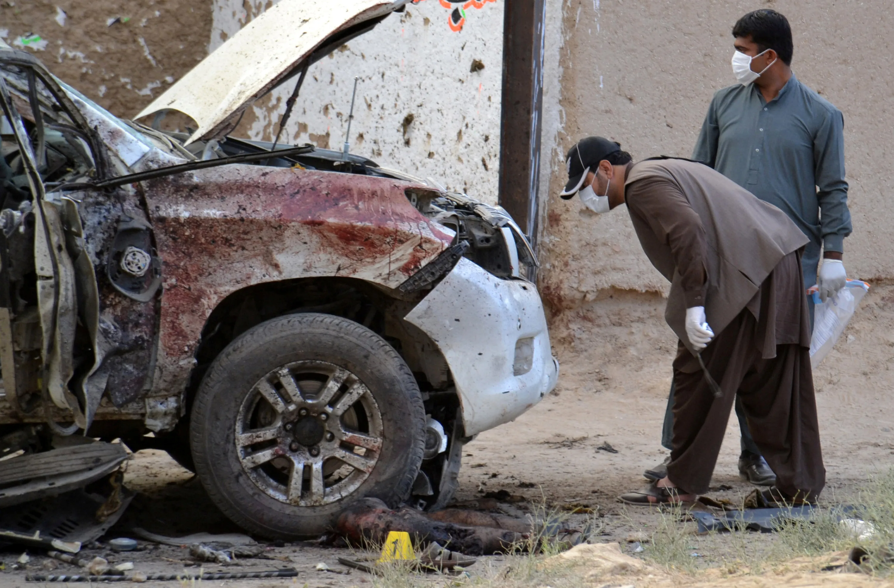 Security officers collect evidence as they investigate crime scene after a bomb exploded next to a convoy of deputy chairman of the Pakistan Senate, Senator Ghafoor Haideri in Mastung, Pakistan, May 12, 2017. (Photo by Naseer Ahmed/Reuters)
