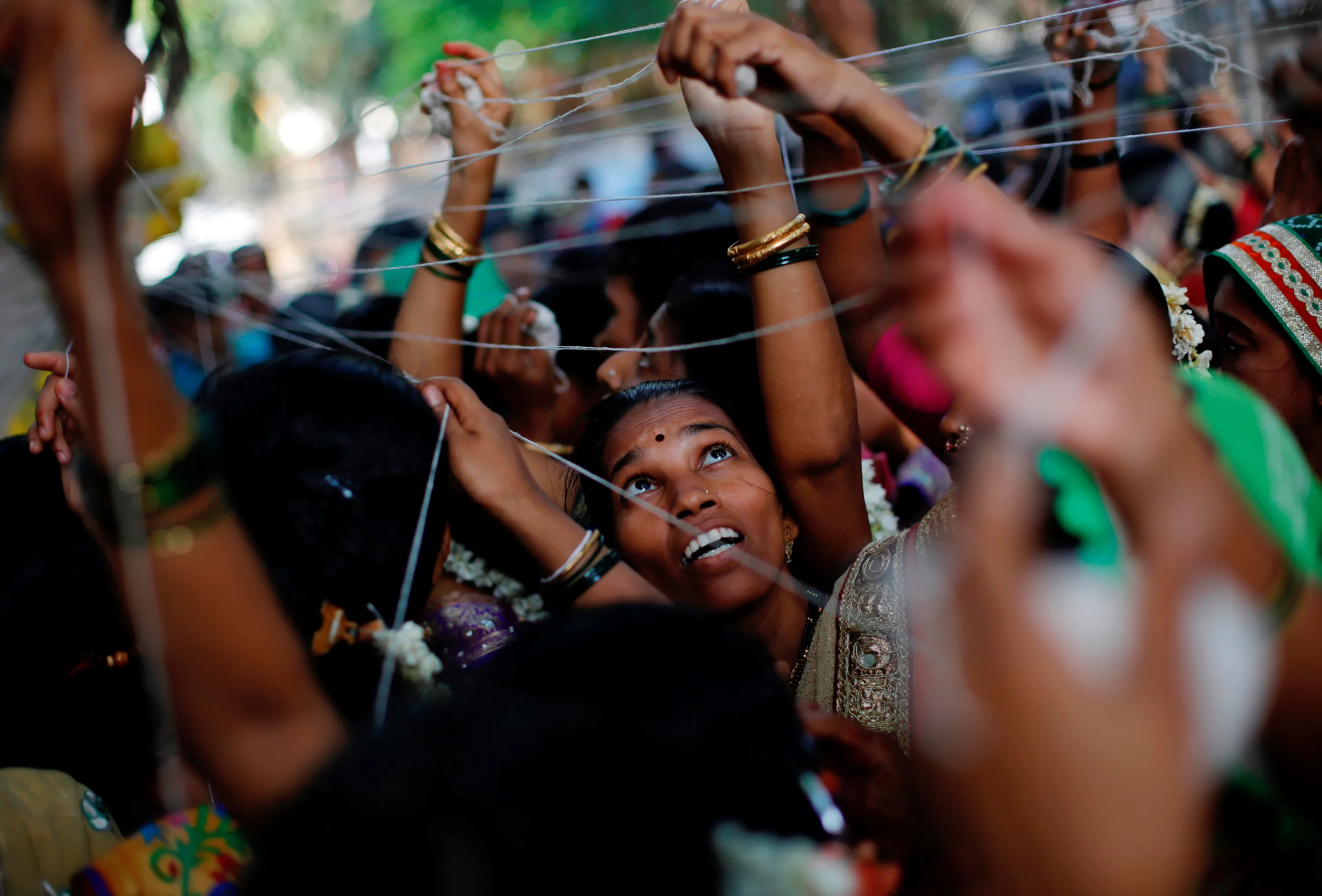Married Hindu women tie cotton threads around a Banyan tree as they perform rituals on “Vat Savitri festival”, which is celebrated on a full moon day, when married women fast and pray for their husbands' health and longevity, in Mumbai, India, June 8, 2017. (Photo by Danish Siddiqui/Reuters)