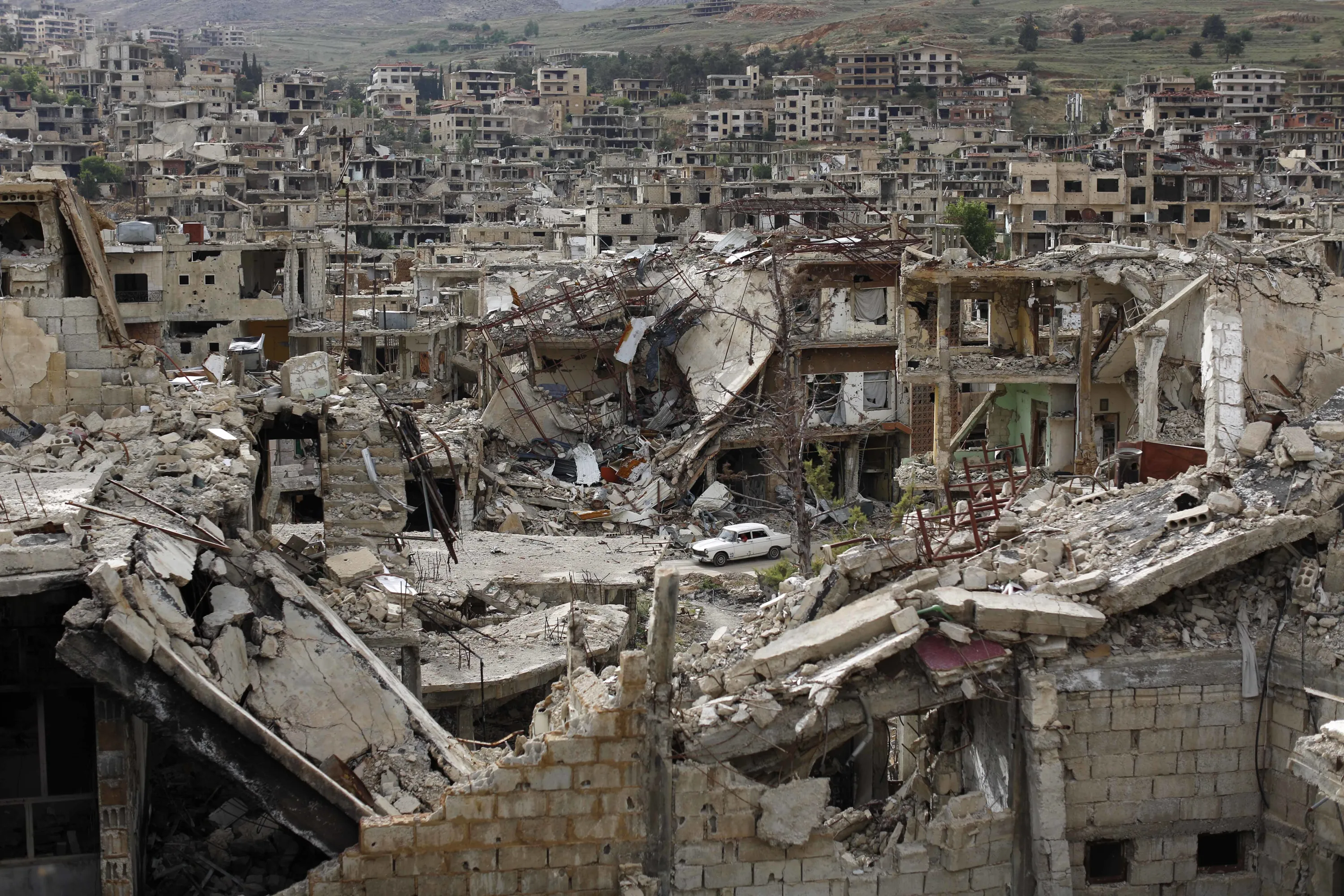 In this May 18, 2017 photo, a car passes by damaged streets at the mountain resort town of Zabadani in the Damascus countryside, Syria. Once a popular summer resort famed for its fruit trees and favored by tourists from rich Gulf Arab countries, the Damascus suburb town of Zabadani is now a deserted, endless vista of pulverized buildings after thousands of rebels were driven out along with the town’s original inhabitants. (Photo by Hassan Ammar/AP Photo)