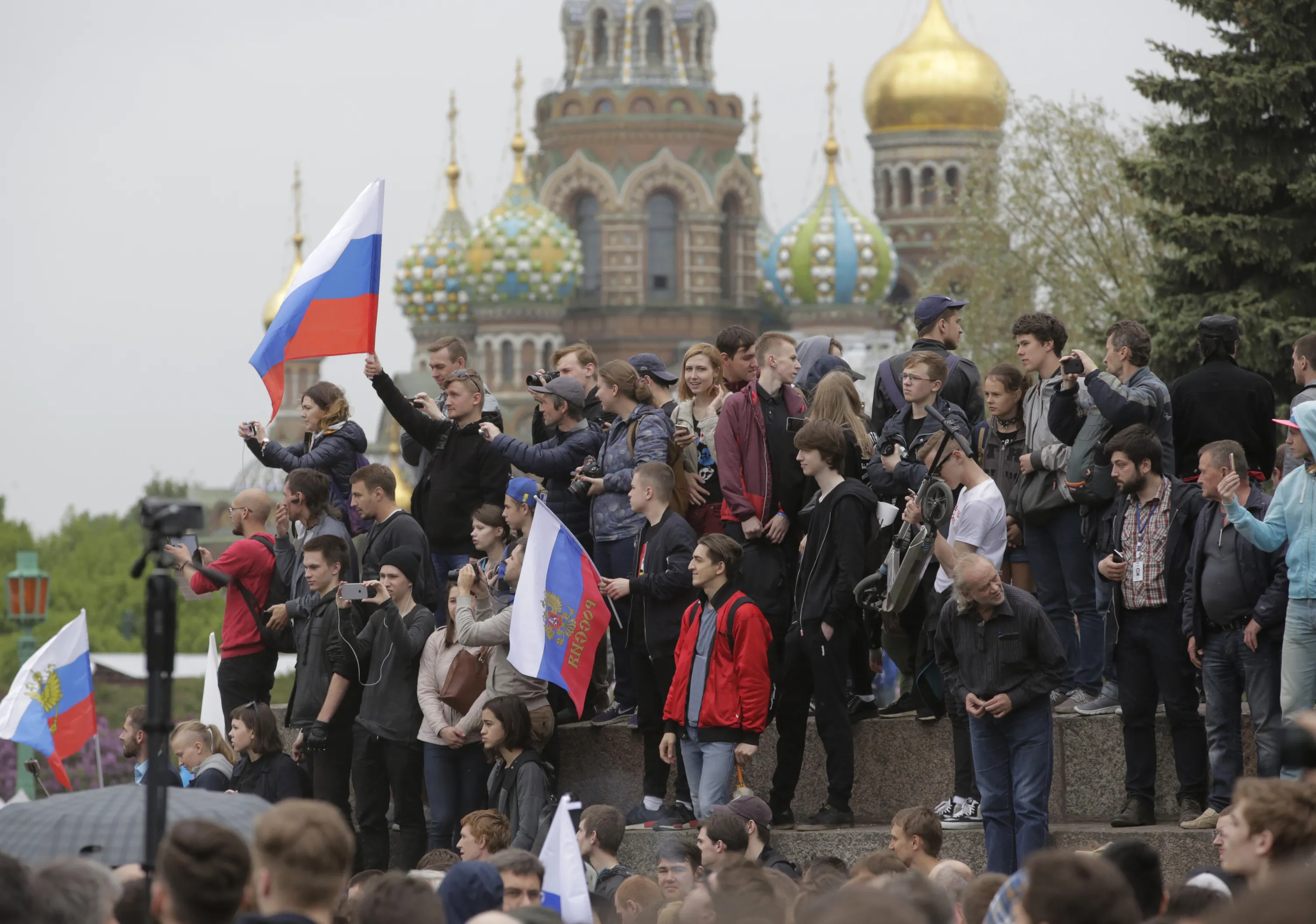 People gather for an anti corruption rally in St.Petersburg, Russia, Monday, June 12, 2017. The protest gatherings in cities from Far East Pacific ports to St. Petersburg were spearheaded by Alexei Navalny, the anti-corruption campaigner who has become the Kremlin's most visible opponent. (Photo by Dmitry Lovetsky/AP Photo)