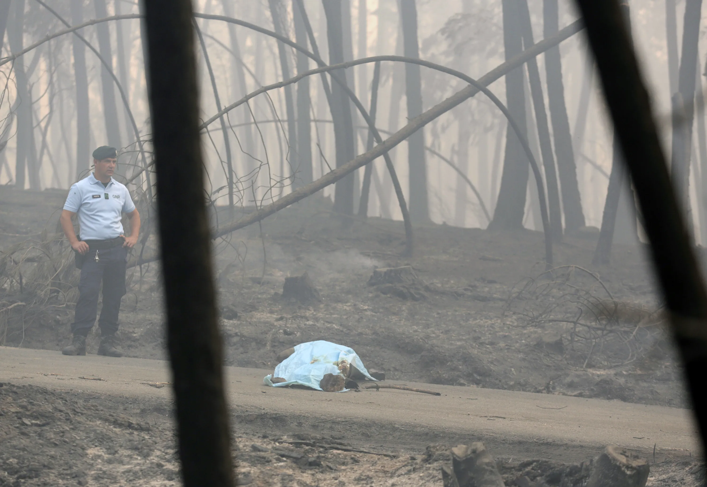 A policeman stands by a covered body on a dirt road outside Pedrogao Grande, central Portugal, Sunday, June 18 2017. Raging forest fires in central Portugal killed more than 50 people, many of them trapped in their cars as flames swept over a road, in what the prime minister on Sunday called “the biggest tragedy of human life that we have known in years”. (Photo by Armando Franca/AP Photo)