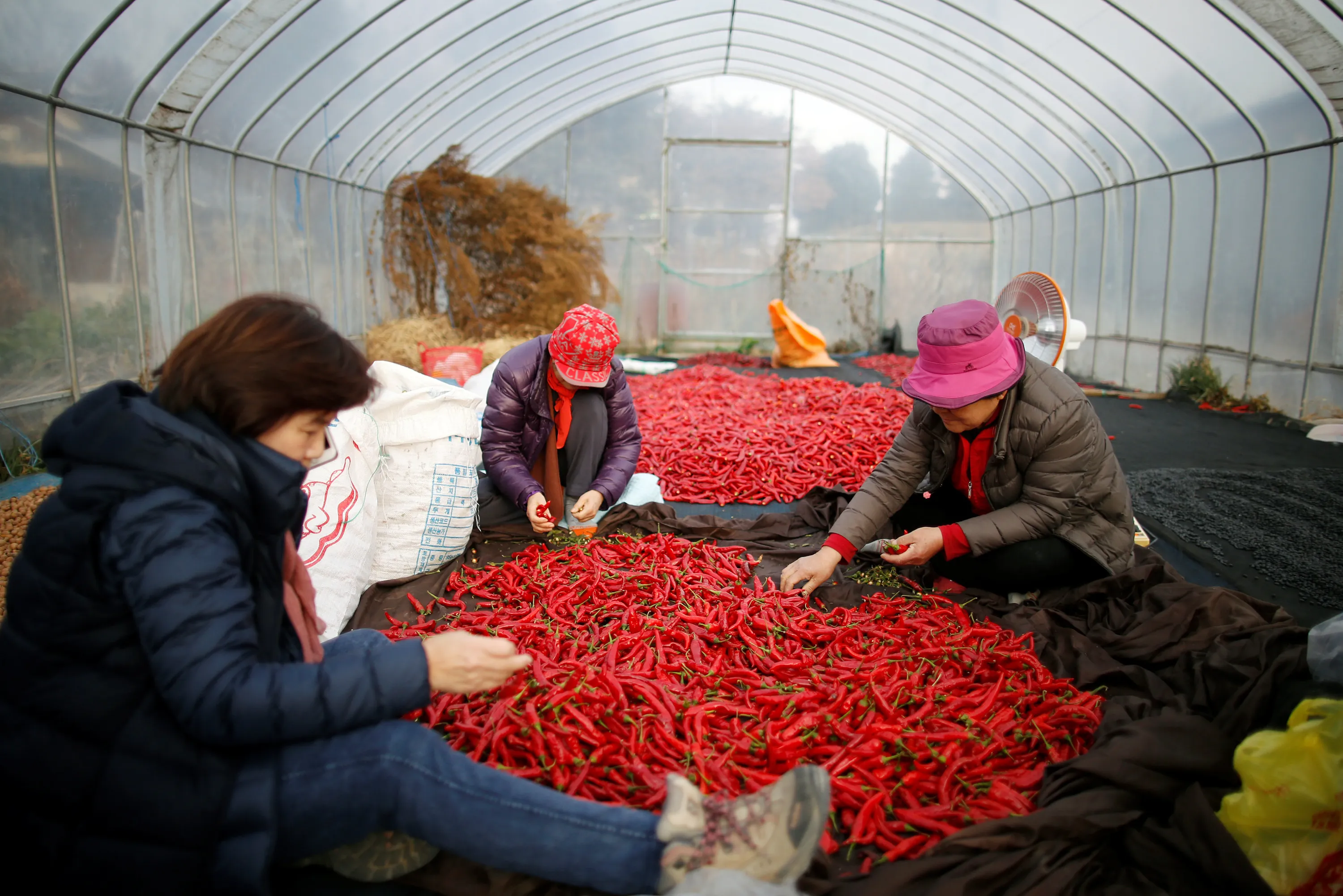 Women sort red peppers at the Tae Sung freedom village near the Military Demarcation Line (MDL), inside the demilitarised zone separating the two Koreas, in Paju, South Korea, November 22, 2016. (Photo by Kim Hong-Ji/Reuters)