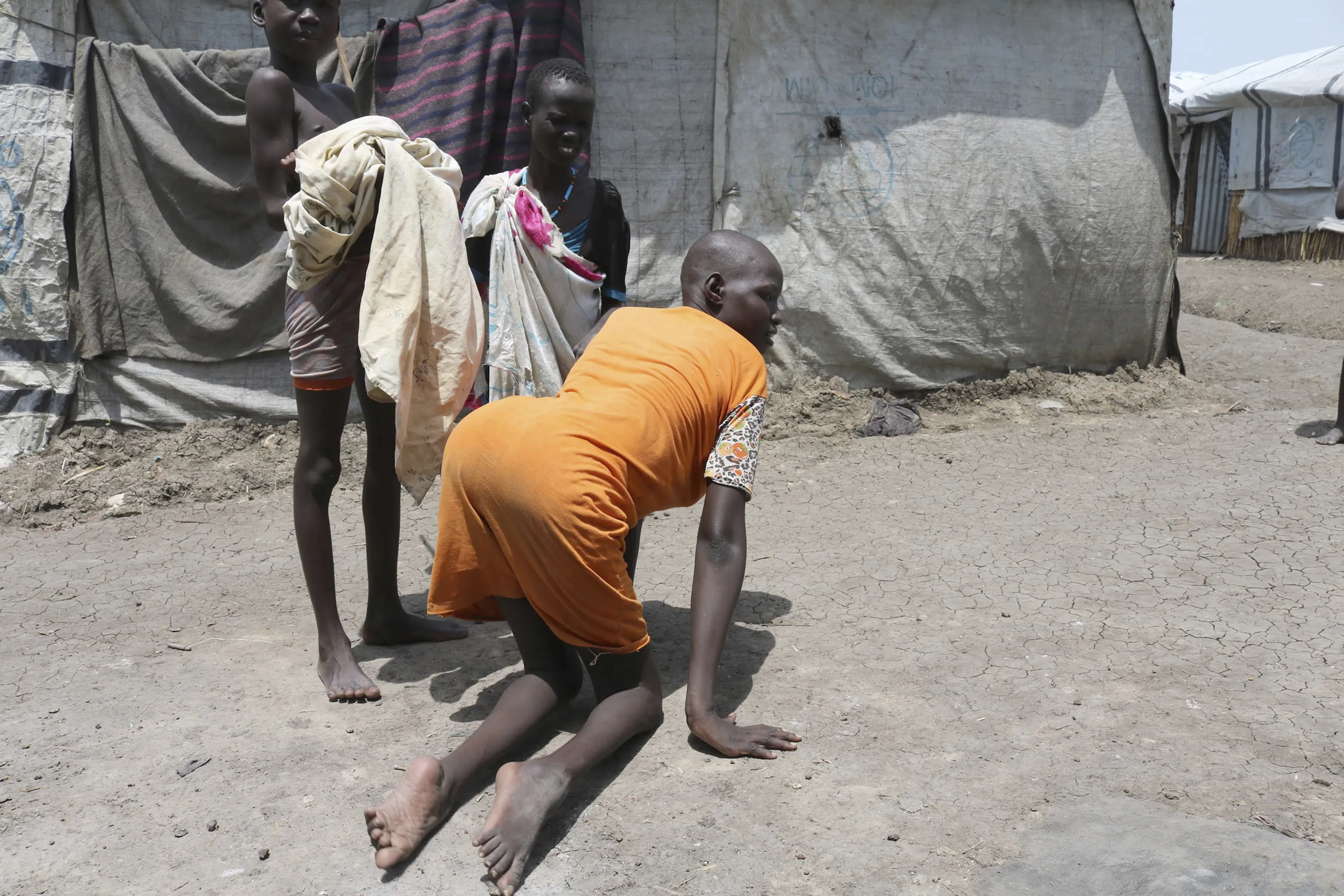In this photo of Friday, June 2, 2017, Nineteen-year-old, Nyang Maria shuffles out of her hut on her hands and knees in Be'ntiu, South Sudan Friday, June 2, 2017. The young woman's suffered from polio her entire life and is unable to use her legs.More than 1.2 million disabled people are being left behind in South Sudan's brutal civil war. The U.N and aid agencies are being told to step up, as those “with disabilities and older people find themselves at much greater risk of starvation or abuse”, a Human Rights Watch report said Wednesday. (Photo by Sam Mednick/AP Photo)