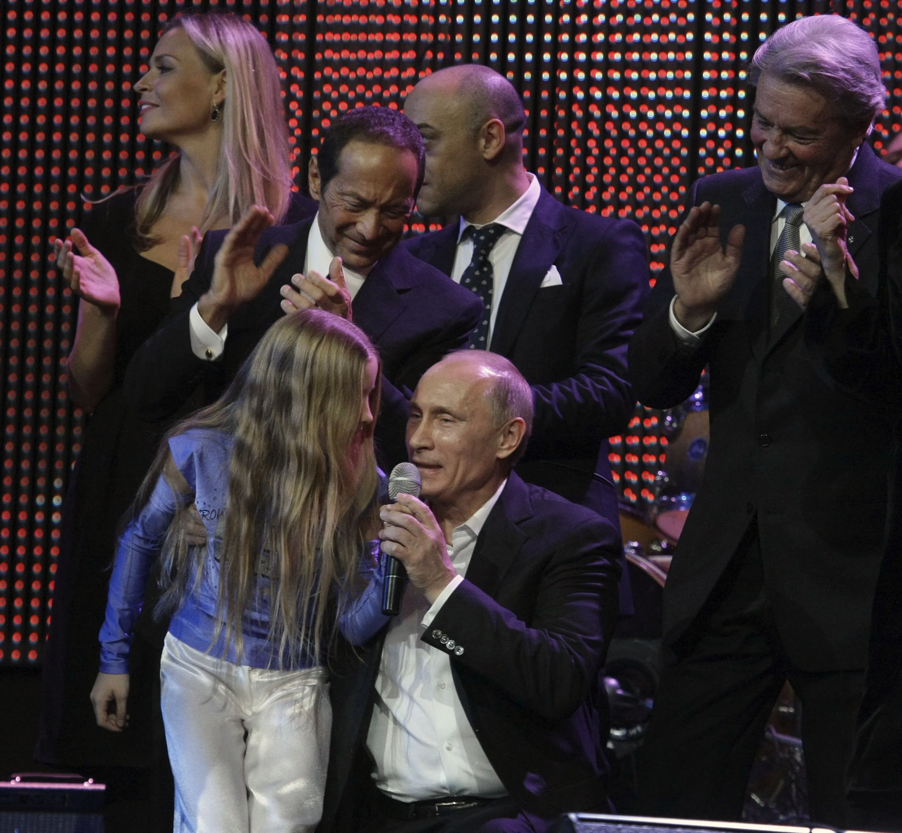 In this Friday, December 10, 2010 photo Russian Prime Minister Vladimir Putin, center, sings during a charity concert in St. Petersburg, Russia. (Photo by Alexei Nikolsky/AP Photo/RIA Novosti)