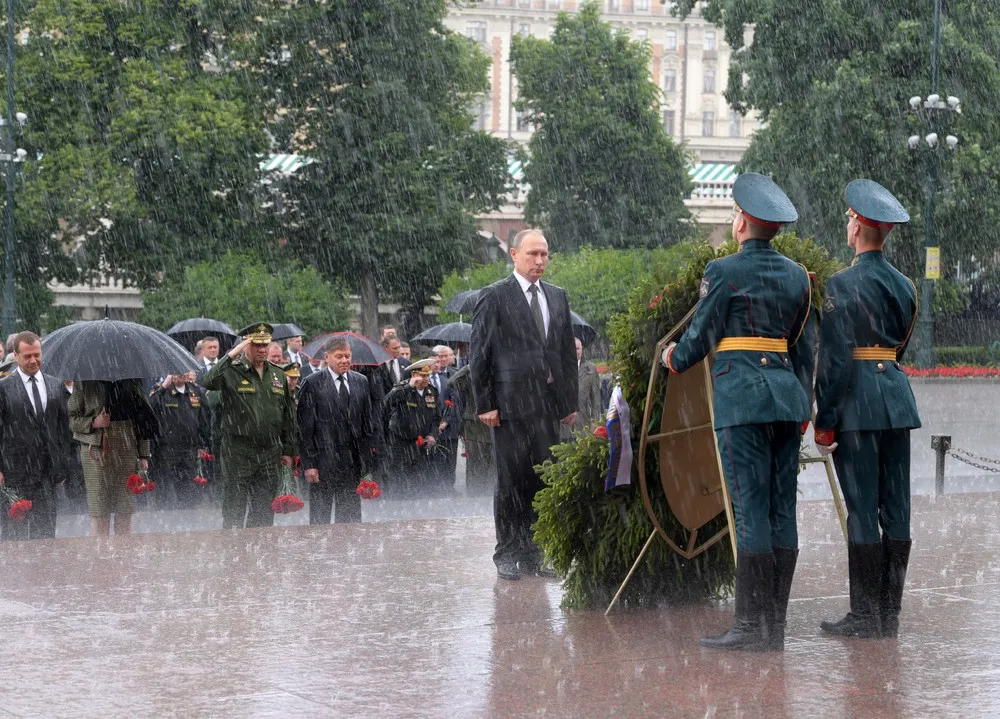 Russian President Vladimir Putin stands in the rain in front of honour guards during a wreath-laying ceremony marking the anniversary of the Nazi German invasion in 1941, by the Kremlin wall in Moscow, Russia June 22, 2017. (Photo by Alexey Druzhinin/Reuters/Sputnik/Kremlin)