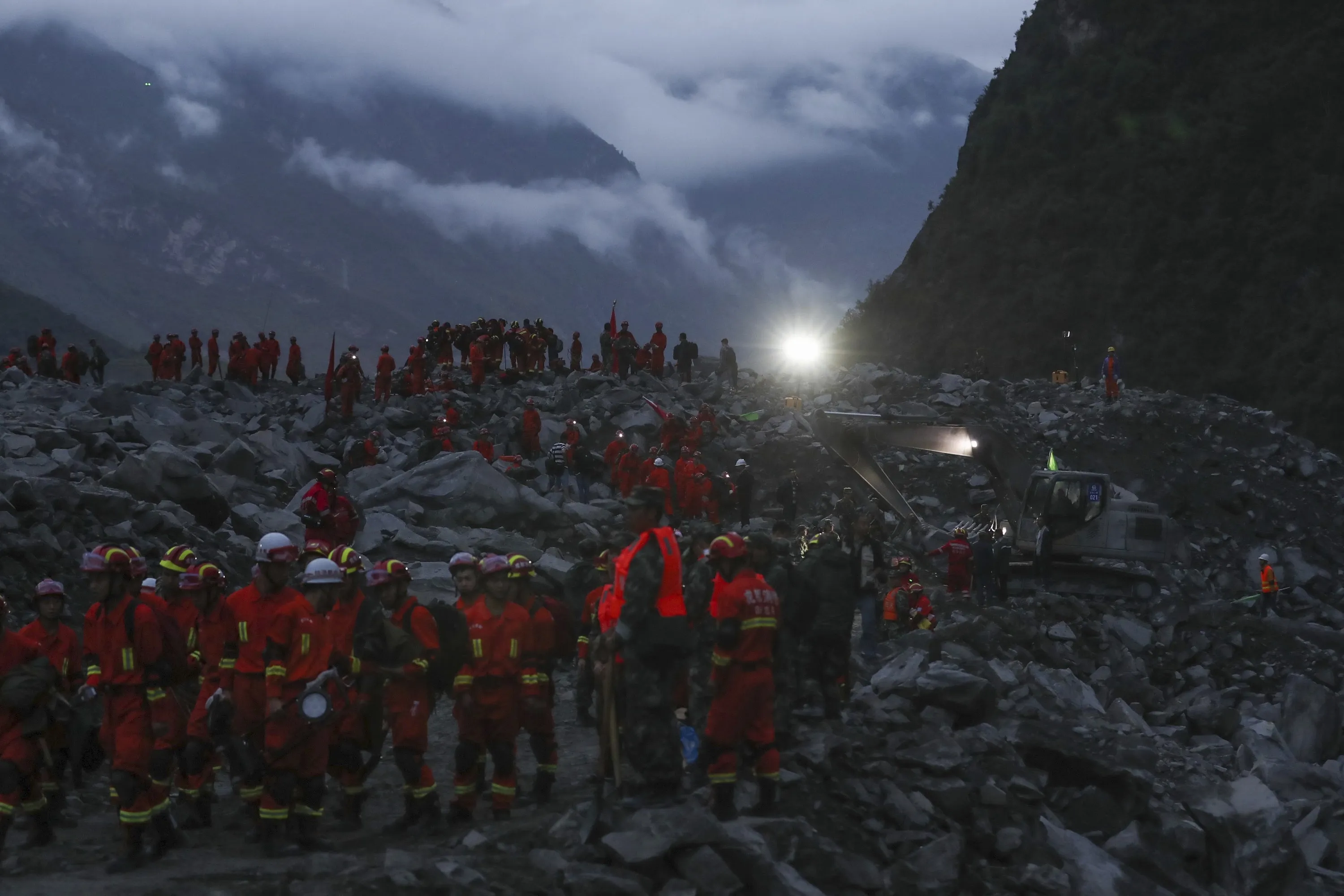 In this June 24, 2017 photo released by China's Xinhua News Agency, rescuers work at the accident site after a landslide occurred in the mountain village of Xinmo, Maoxian county, in southwestern China's Sichuan Province. Crews searching through the rubble left by a landslide that buried a mountain village under tons of soil and rocks in southwestern China on Saturday found more than a dozen of bodies, but more than 100 more people remained missing. (Photo by Jiang Hongjing/Xinhua via AP Photo)