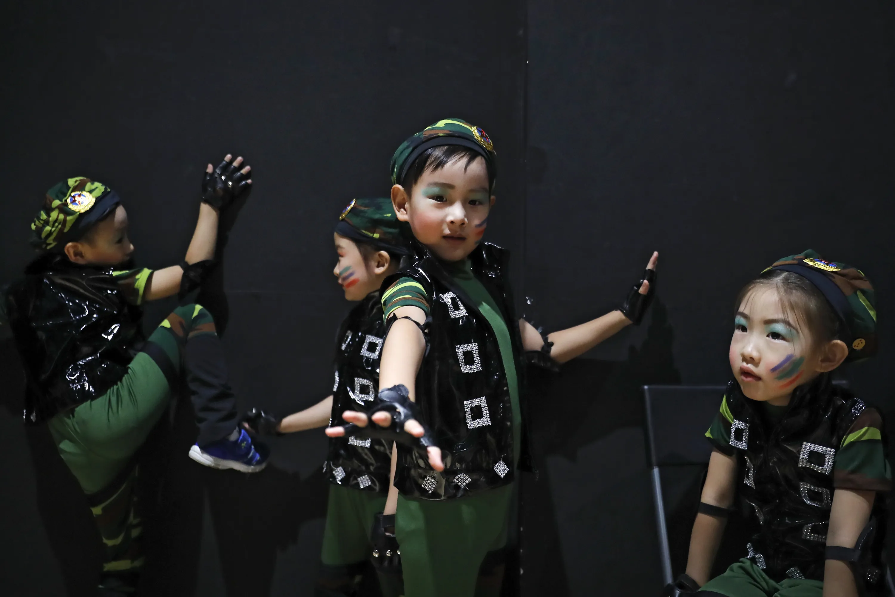 In this Friday, June 23, 2017 photo, kindergarten children wearing military costumes with PLA badges play as they prepare at backstage for a performance during a graduation ceremony in Beijing. (Photo by Andy Wong/AP Photo)