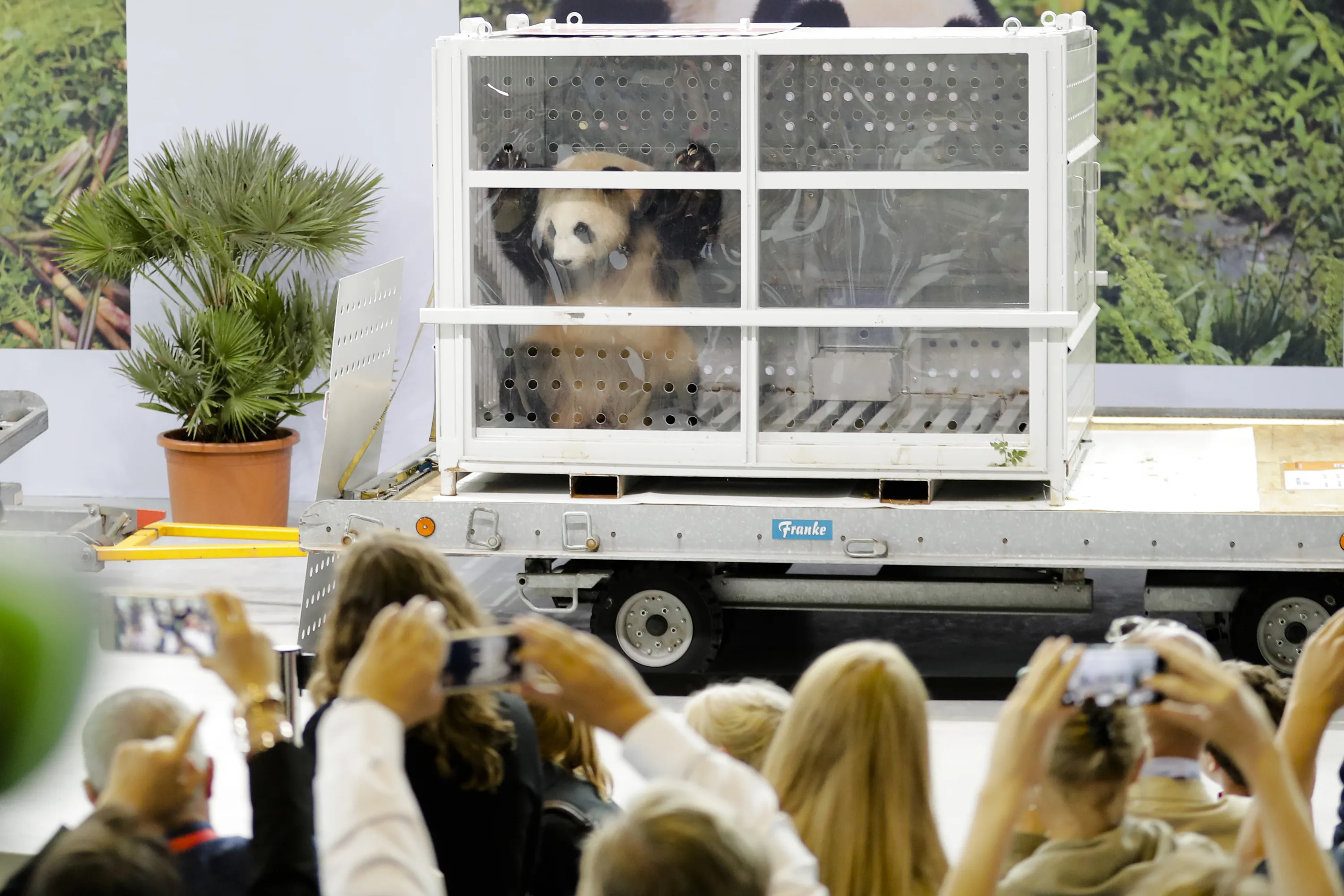 Giant panda Meng Meng looks out of its container during a presentation after the arrival from China at the airport Schoenefeld near Berlin, Saturday, June 24, 2017. (Photo by Markus Schreiber/AP Photo)
