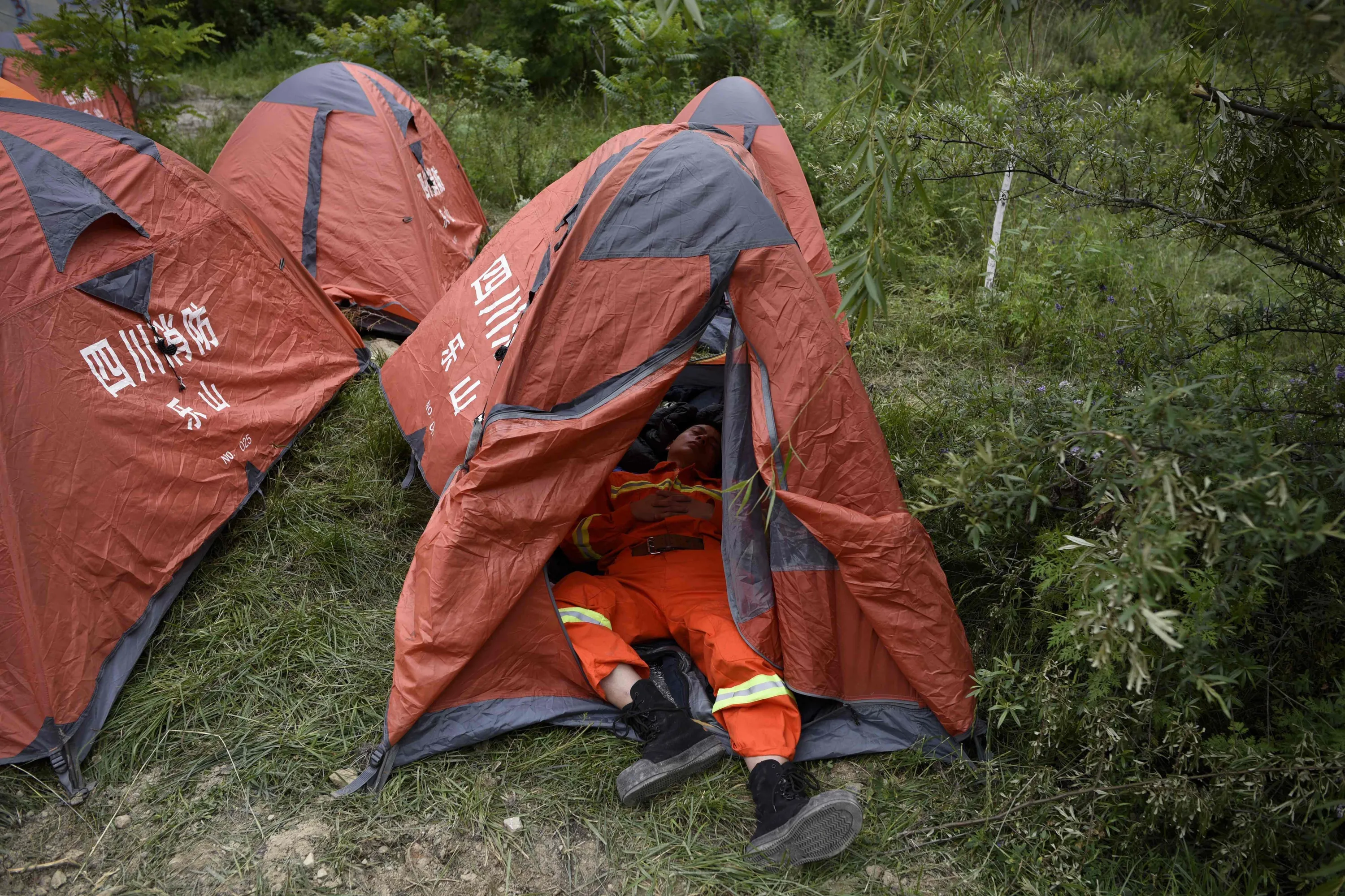 A rescue worker takes a rest in a tent near landslide area in the village of Xinmo in Maoxian county, China's Sichuan province on June 24, 2017. (Photo by Wang Zhao/AFP Photo)