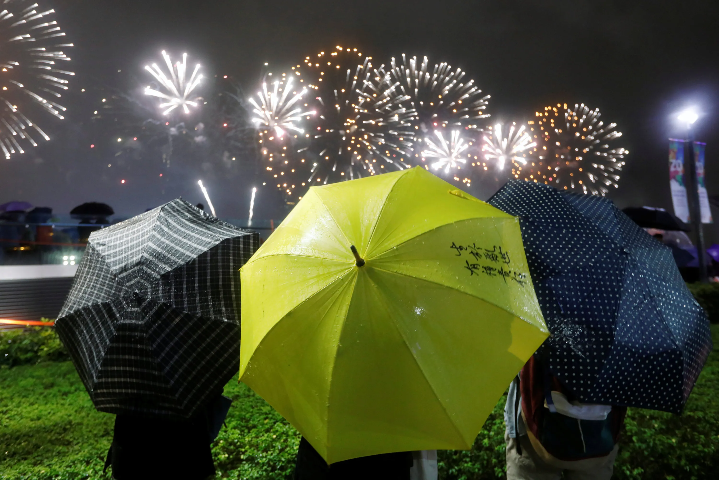 A pro-democracy protester holds a yellow umbrella, the symbol of the Occupy Central movement, as she watches fireworks explode over Victoria Harbour, as part of the celebration for the 20th anniversary of the city's handover from British to Chinese rule, in Hong Kong, China July 1, 2017. (Photo by Tyrone Siu/Reuters)