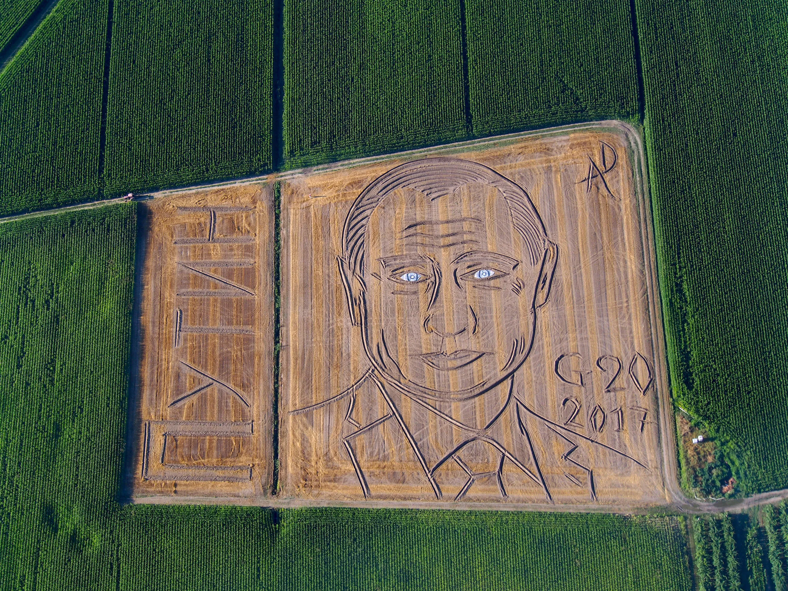 In this picture taken Monday, July 3, 2017, a giant portrait of Russian President Vladimir Putin appeared in a field in Castagnaro, near the northern Italian city of Verona. Alongside was the caption “G20 2017” and the signature of Italian land-artist Dario Gambarin. Gambarin used a tractor to create the 135 metre (443 foot) wide picture just a few days ahead of the fortcoming G20 summit, to be held in Hamburg July 7-8. Gambarin says he doesn't measure the field before starting his work, but is apparently able to create perfectly dimensioned giant images with just an innate sense of proportion and the ability to drive a tractor. (Photo by Dario Gambarin via AP Photo)