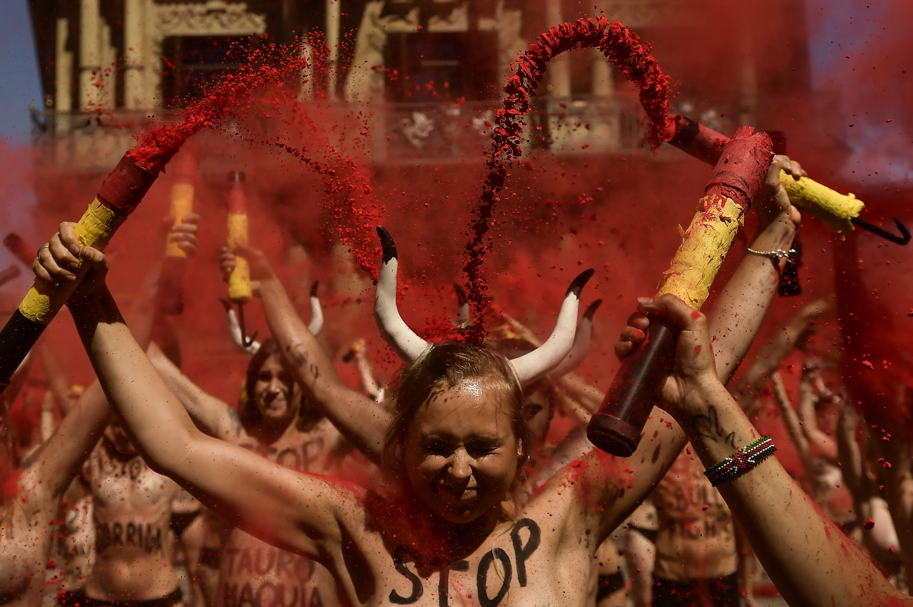Demonstrators brake “banderillas” with red dust during a protest against bullfighting in front of the City Hall a day before of the San Fermin festival, in Pamplona, northern Spain, Wednesday, July 5, 2017. The festival will begin on July 6 with the “txupinazo” opening ceremony, with people participating in bull runs, music and dance, through the old city. (Photo by Alvaro Barrientos/AP Photo)
