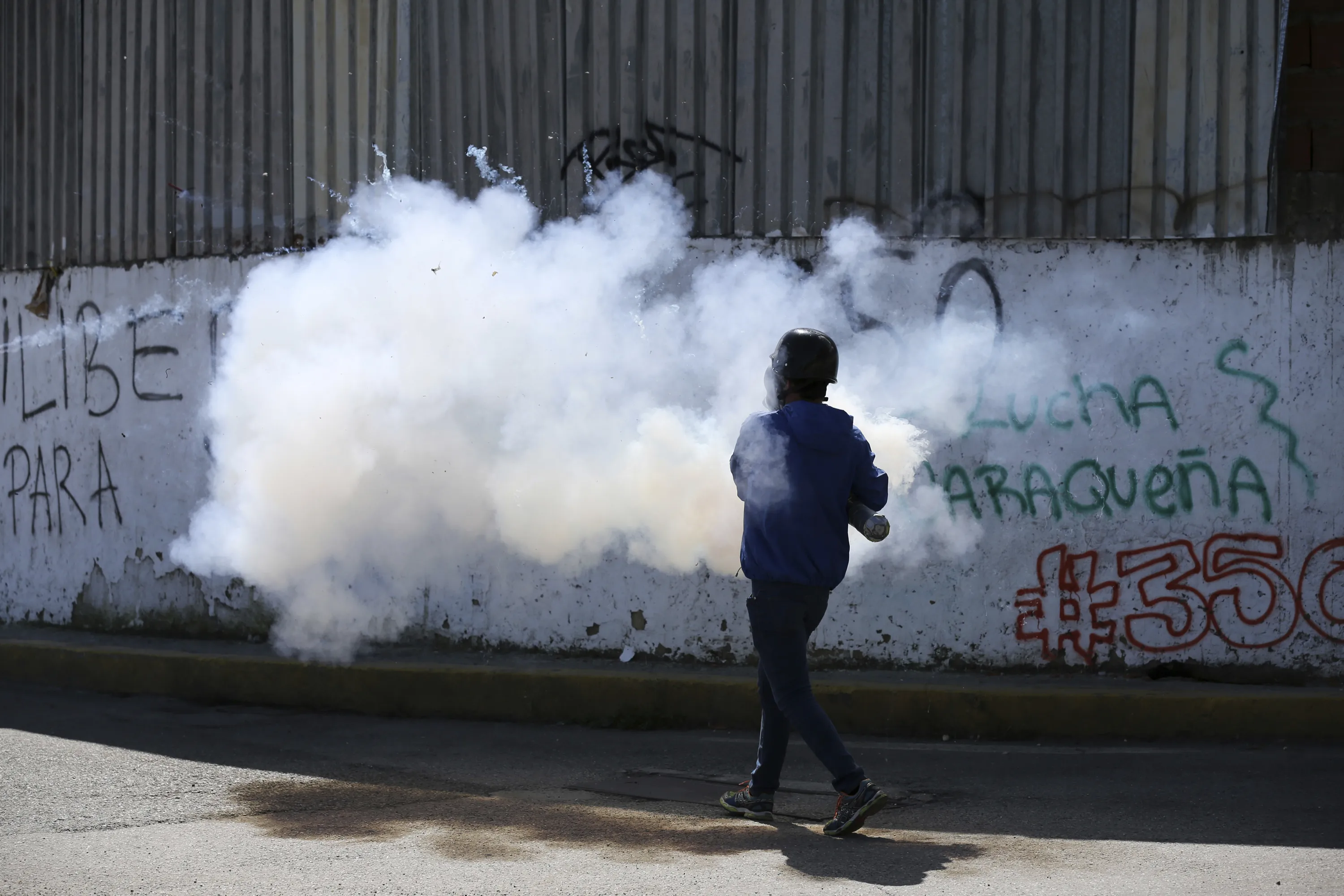 A demonstrator fires fireworks at security forces with a home made mortar during clashes in Caracas, Venezuela, Tuesday, July 4, 2017. Opposition protests demanding new elections and decrying triple-digit inflation, food shortages and worsening crime continue as President Nicolas Maduro pushes forward with his plan to draft a new constitution. (Photo by Fernando Llano/AP Photo)