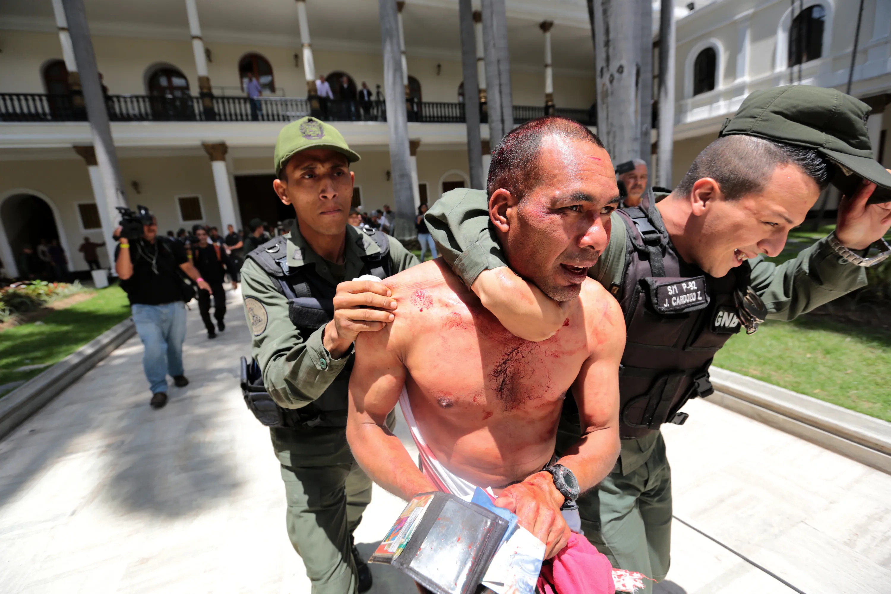 A supposed government supporter who was part of a group that tried to force its way into the National Assembly, is temporarily detained by national guardsmen, but let go soon after, in Caracas, Venezuela, Wednesday, July 5, 2017. Pro-government militias wielding wooden sticks and metal bars violently stormed congress and began attacking opposition lawmakers at the end of a special session coinciding with Venezuela’s independence day. (Photo by Fernando Llano/AP Photo)