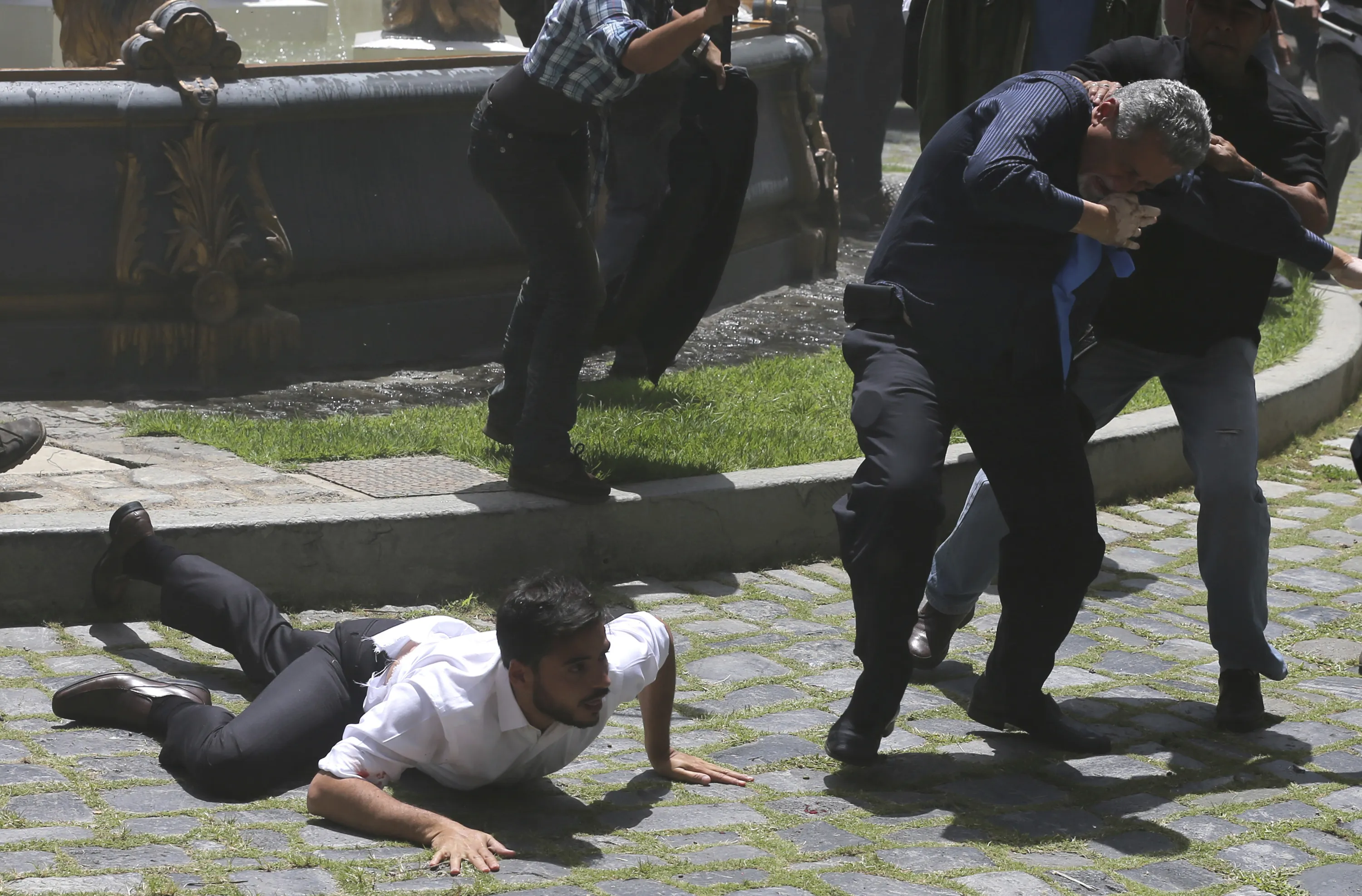 Opposition lawmaker Armando Armas plays possum as fellow legislator Americo De Grazia is slugged by a member of a pro-government militia member during an attack on opposition lawmakers and assembly employees in Caracas, Venezuela, Wednesday, July 5, 2017. Several lawmakers were injured in the attack. De Grazia was taken in a stretcher to an ambulance suffering from convulsions, said a fellow lawmaker. (Photo by Fernando Llano/AP Photo)