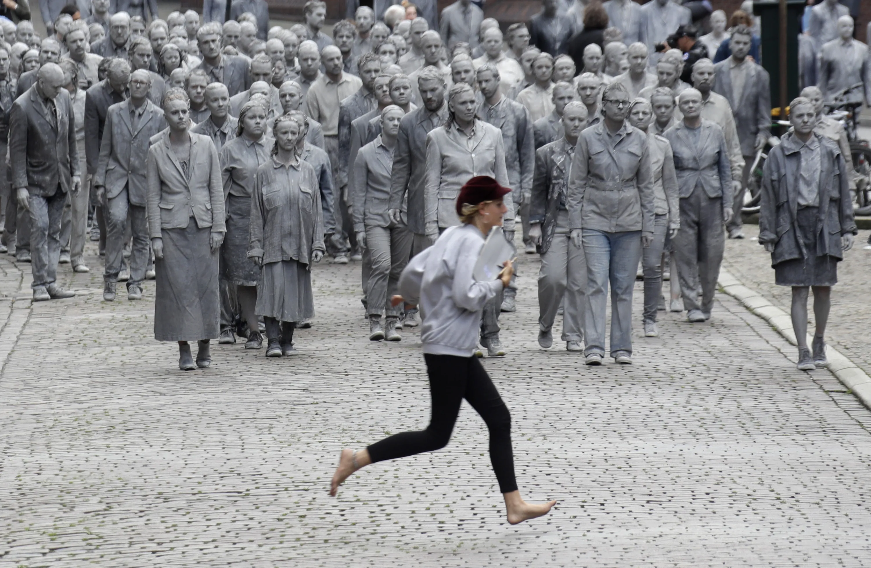 A woman crosses the street in front of the approaching performance “1000 Gestalten” with hundreds of people painted like clay figures moving slowly and silently through the streets of Hamburg to protest against the G-20 summit in Hamburg, northern Germany, Wednesday, July 5, 2017. (Photo by Matthias Schrader/AP Photo)
