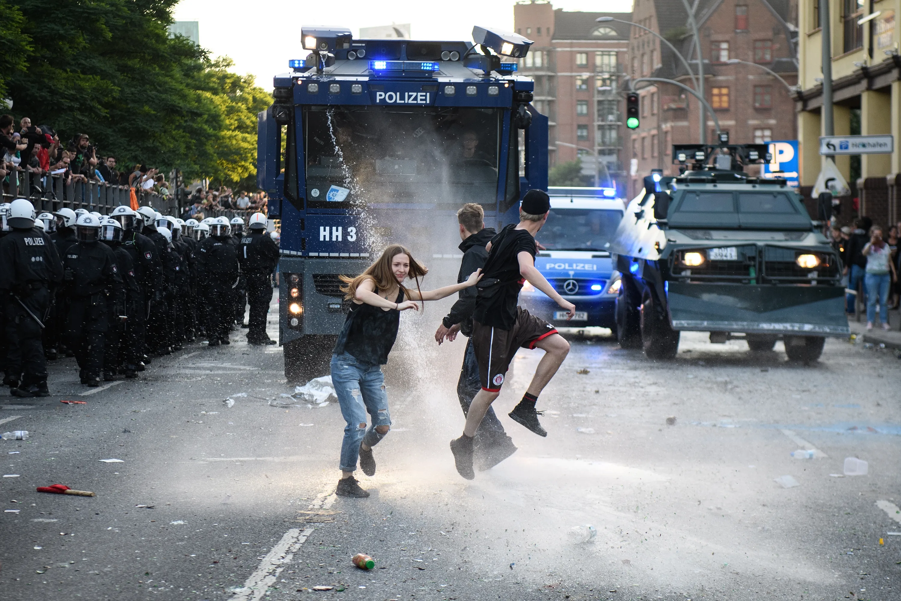 Protestors are sprayed by police water cannons during the “Welcome to Hell” anti-G20 protest march on July 6, 2017 in Hamburg, Germany. Leaders of the G20 group of nations are arriving in Hamburg today for the July 7-8 economic summit and authorities are bracing for large-scale and disruptive protest efforts. (Photo by Leon Neal/Getty Images)