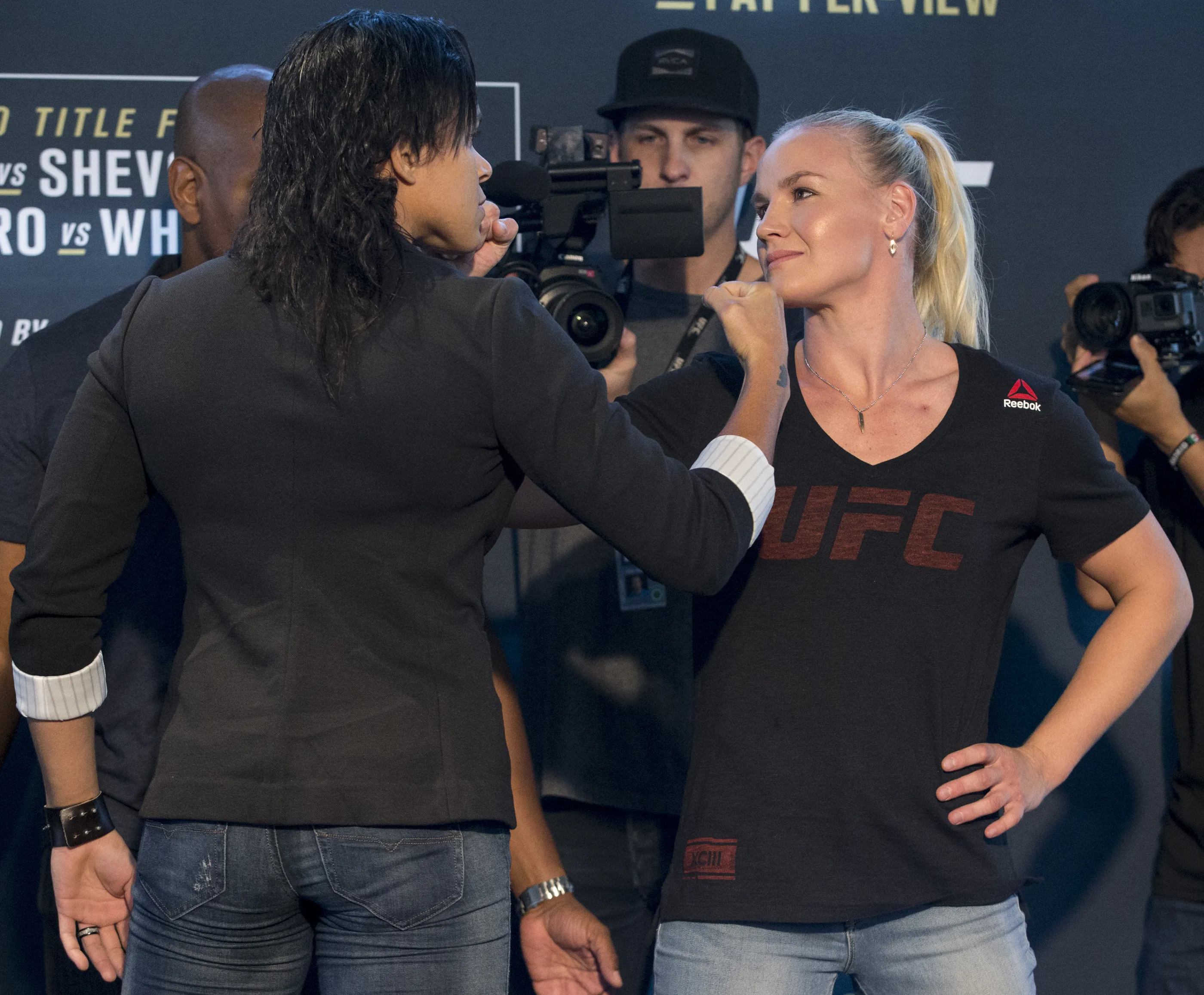 Amanda Nunes, left, and Valentina Shevchenko, pose during media day for Saturday's UFC 213, in Las Vegas on Thursday, July 6, 2017. (Photo by Erik Verduzco/Las Vegas Review-Journal via AP Photo)