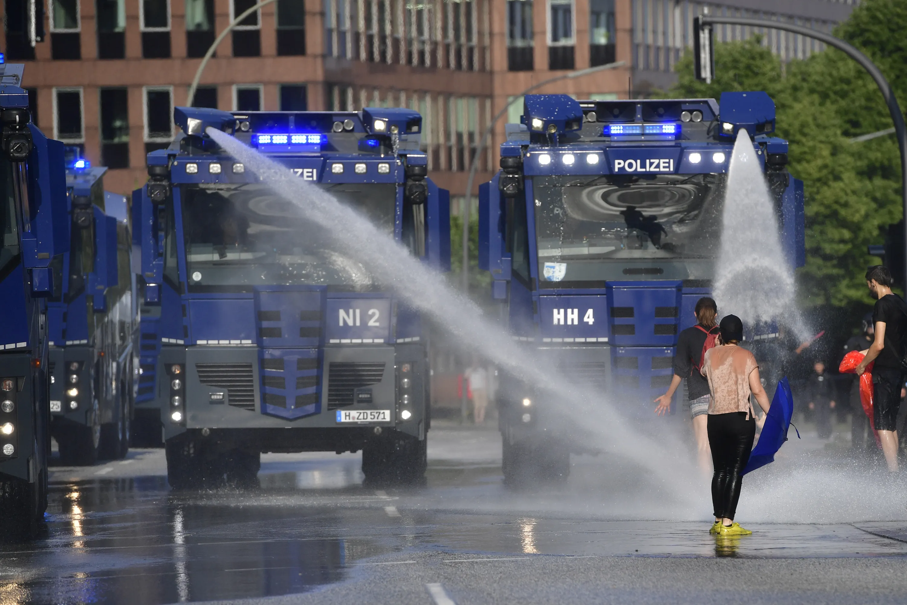 Police use water cannons as protesters gather to participate in an anti-G20 march on July 7, 2017 in Hamburg, Germany. Authorities are braced for large-scale and disruptive protests as Leaders of the G20 group of nations arrive in Hamburg for the July 7-8 G20 summit. (Photo by Alexander Koerner/Getty Images)