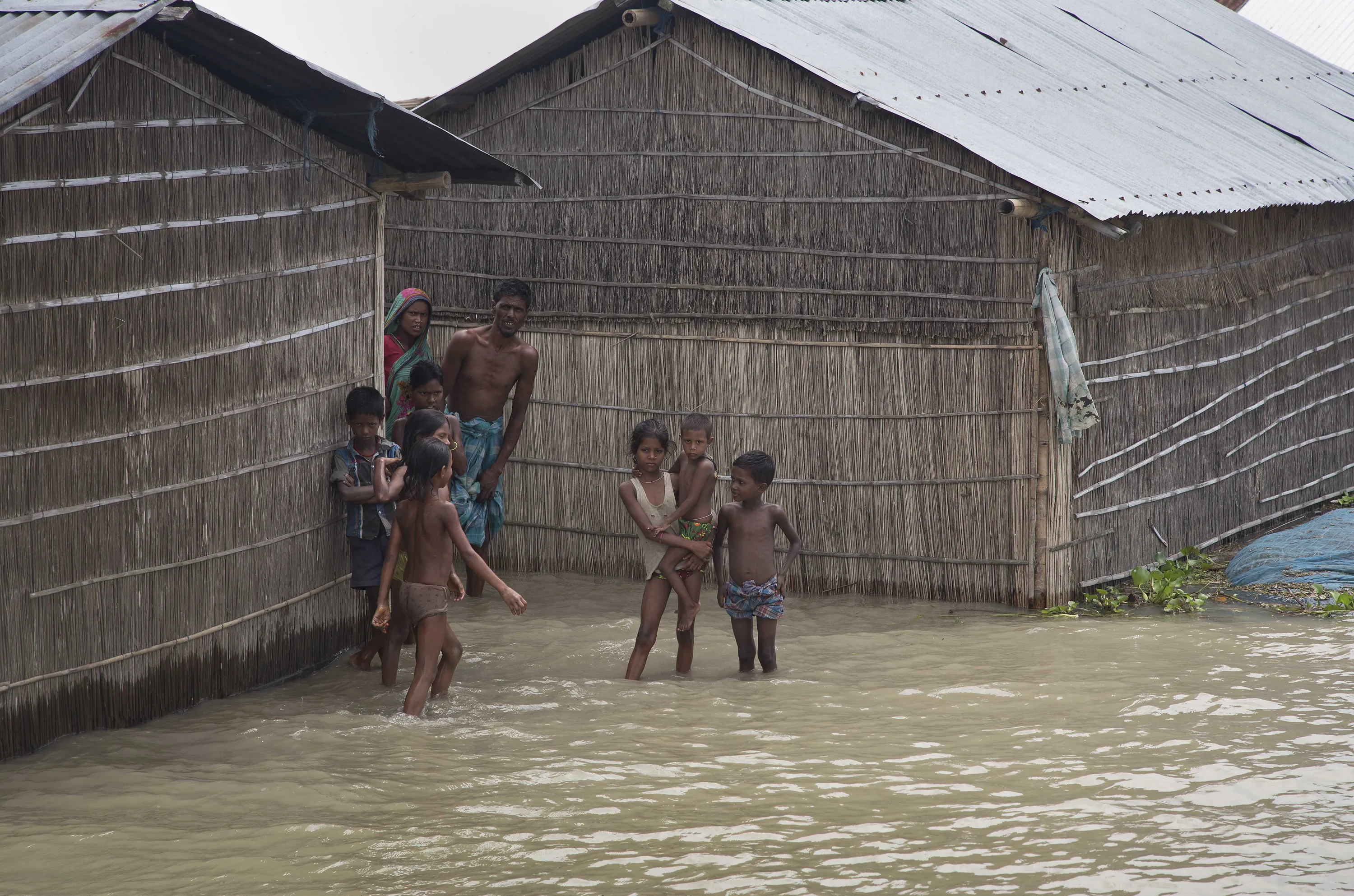 Indian villagers stand outside their houses partially submerged in flood waters in Burgaon, 80 kilometers (50 miles) east of Gauhati, Assam state, India, Wednesday, July 5, 2017. Heavy rains since the start of India's monsoon season have triggered floods and landslides in parts of the remote northeastern region, causing at least 20 deaths, authorities said Wednesday. (Photo by Anupam Nath/AP Photo)