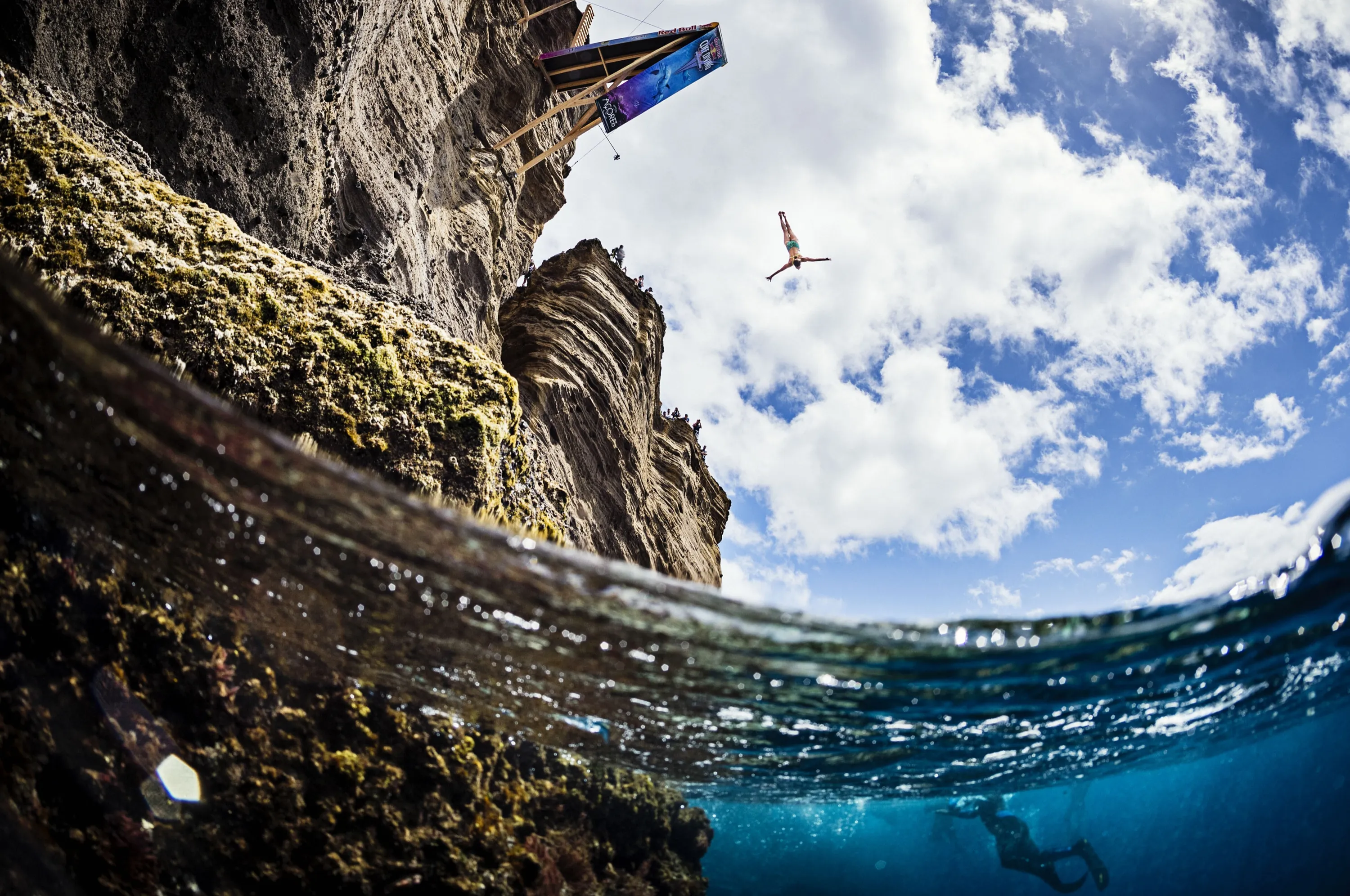 In this handout image provided by Red Bull, Anna Bader of Germany dives from the 21 metre platform on Islet Franca do Campo during the second stop of Red Bull Cliff Diving World Series on July 9, 2017 in Sao Miguel, Azores, Portugal. (Photo by Samo Vidic/Red Bull via Getty Images)