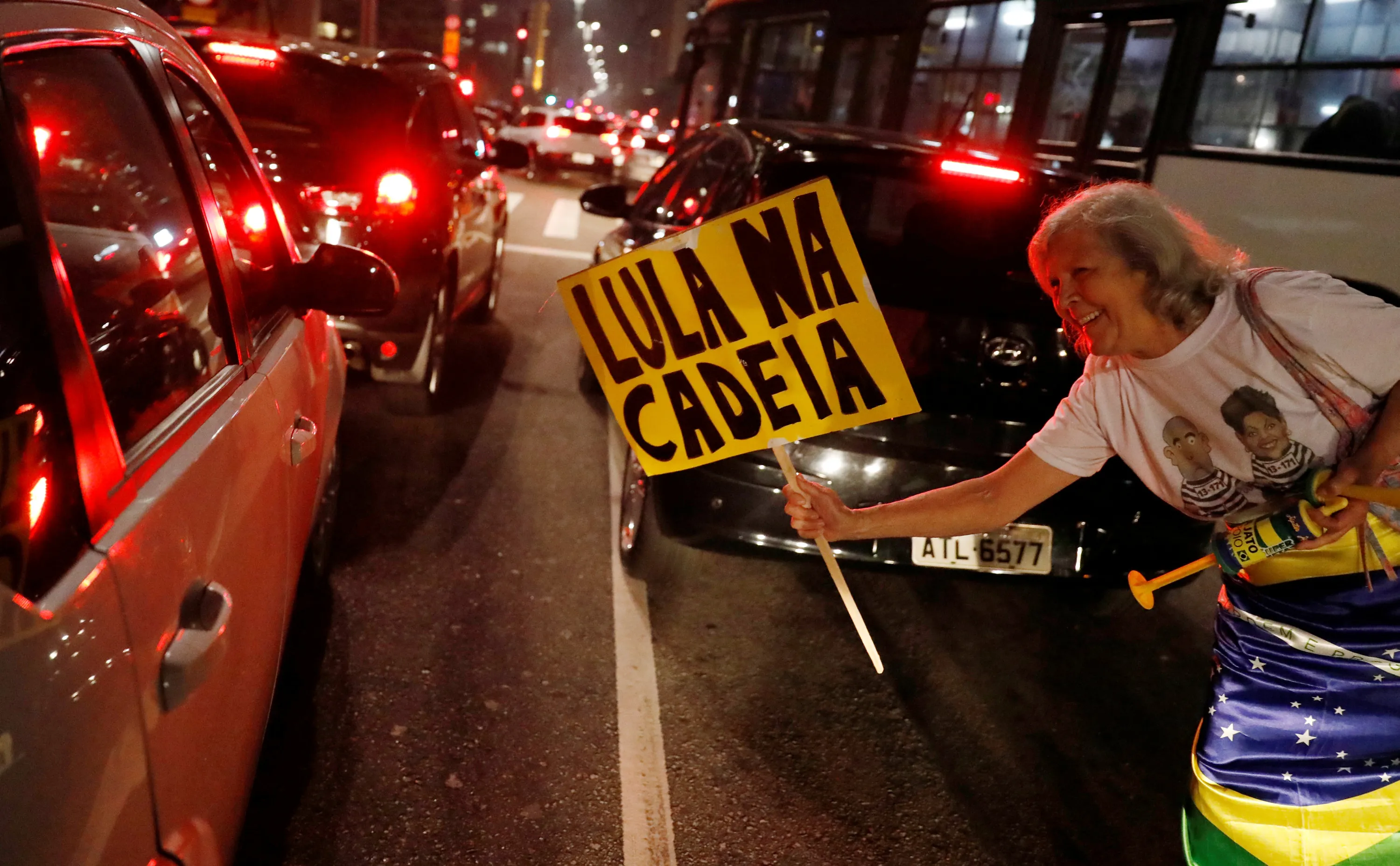 A woman celebrates after former Brazilian President Luiz Inacio Lula da Silva, was convicted on corruption charges and sentenced to nearly 10 years in prison in Sao Paulo, Brazil July 12, 2017. The sign reads: “Lula in Jail”. (Photo by Nacho Doce/Reuters)