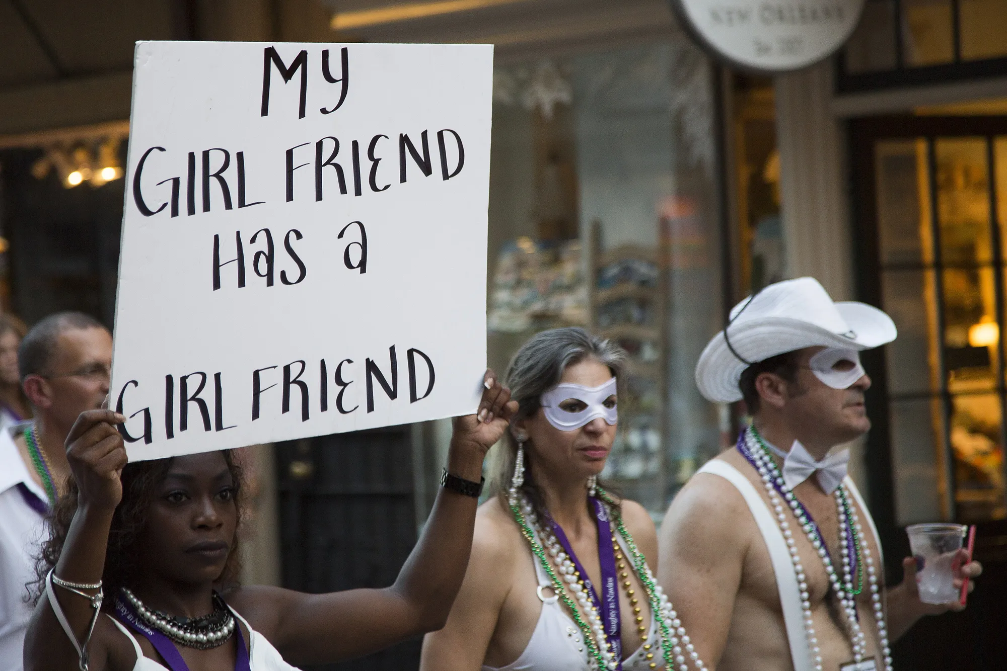 A provocative sign is displayed during the Sexual Freedom Parade, part of Naughty in N'awlins held in New Orleans, Louisiana, Wednesday July 5th, 2017. These are the photos from inside the world’s largest swinging convention for couples. The exclusive images reveal the unlikely couples who like to engage in sexual relations with other people besides their partners – and show that swinging is more ‘normal’ than you think. Over 1,000 couples attend “Naughty in N’awlins” in New Orleans, USA every year. The week-long convention consists of seminars, workshops, naked speed dating events, nightly erotic theme balls and a groundbreaking Sexual Freedom Parade. The Parade brings awareness to polyamorous relationships, archaic laws outlawing sex toys as well as couples in the swinging lifestyle. (Photo by Mathew Growcoot/News Dog Media)