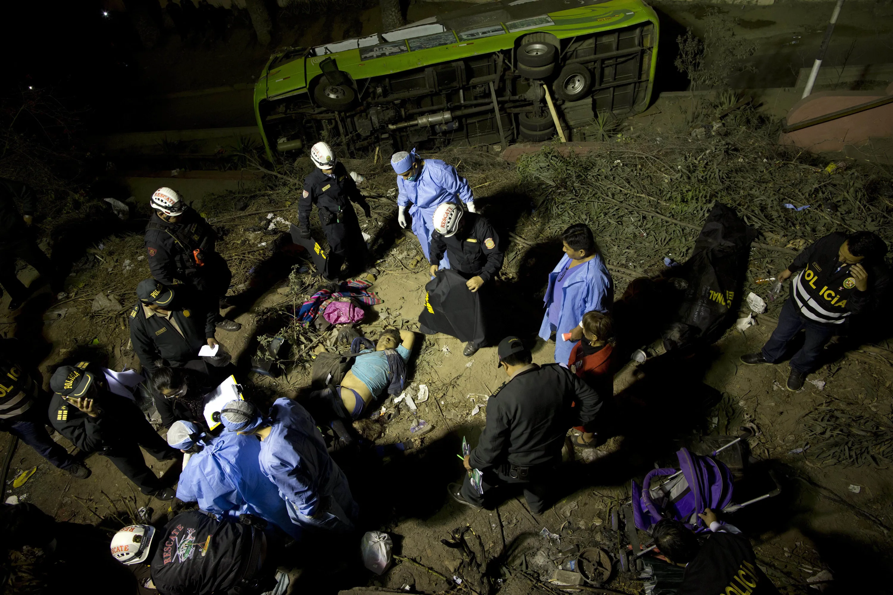 In this Sunday, July 9, 2017 photo, rescue workers and police work the scene after a deadly bus accident in Lima, Peru. Peruvian officials said a double-decker tour bus went out of control and rolled over on a narrow road in the hills. (Photo by Rodrigo Abd/AP Photo)