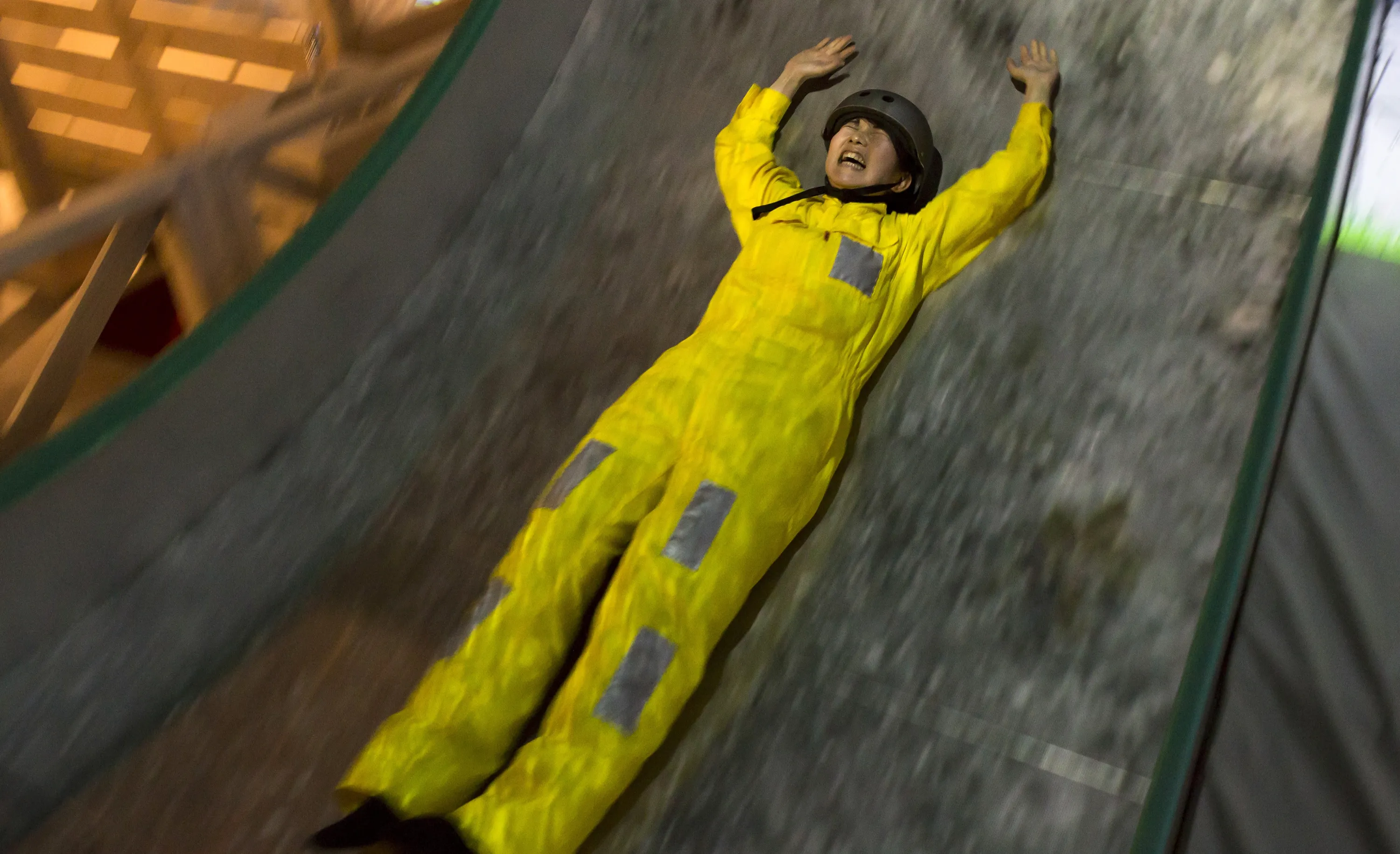 A staff member tries the Niagara Drop virtual reality (VR) attraction at the VR Zone Shinjuku theme park, operated by Bandai Namco Entertainment Inc., on July 13, 2017 in Tokyo, Japan. The park is one of Japan's largest VR theme parks with 16 VR attractions opening to the public on July 14. (Photo by Tomohiro Ohsumi/Getty Images)