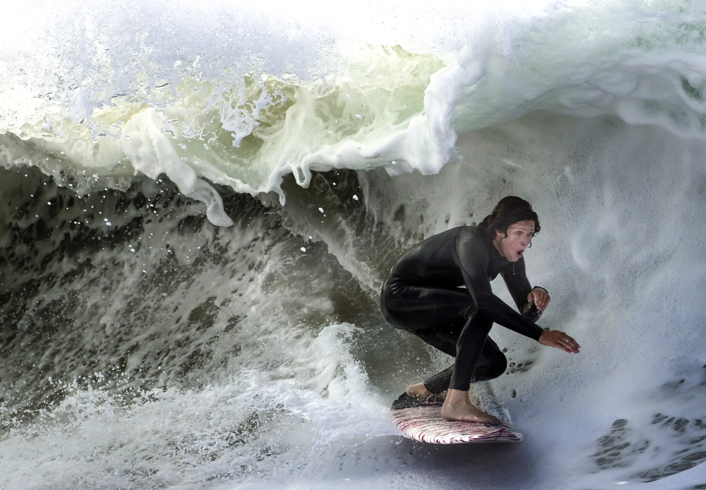 A surfer performs at the Wedge in Newport Beach, Calif., Monday, July 10, 2017. (Photo by Mindy Schauer/The Orange County Register via AP Photo)