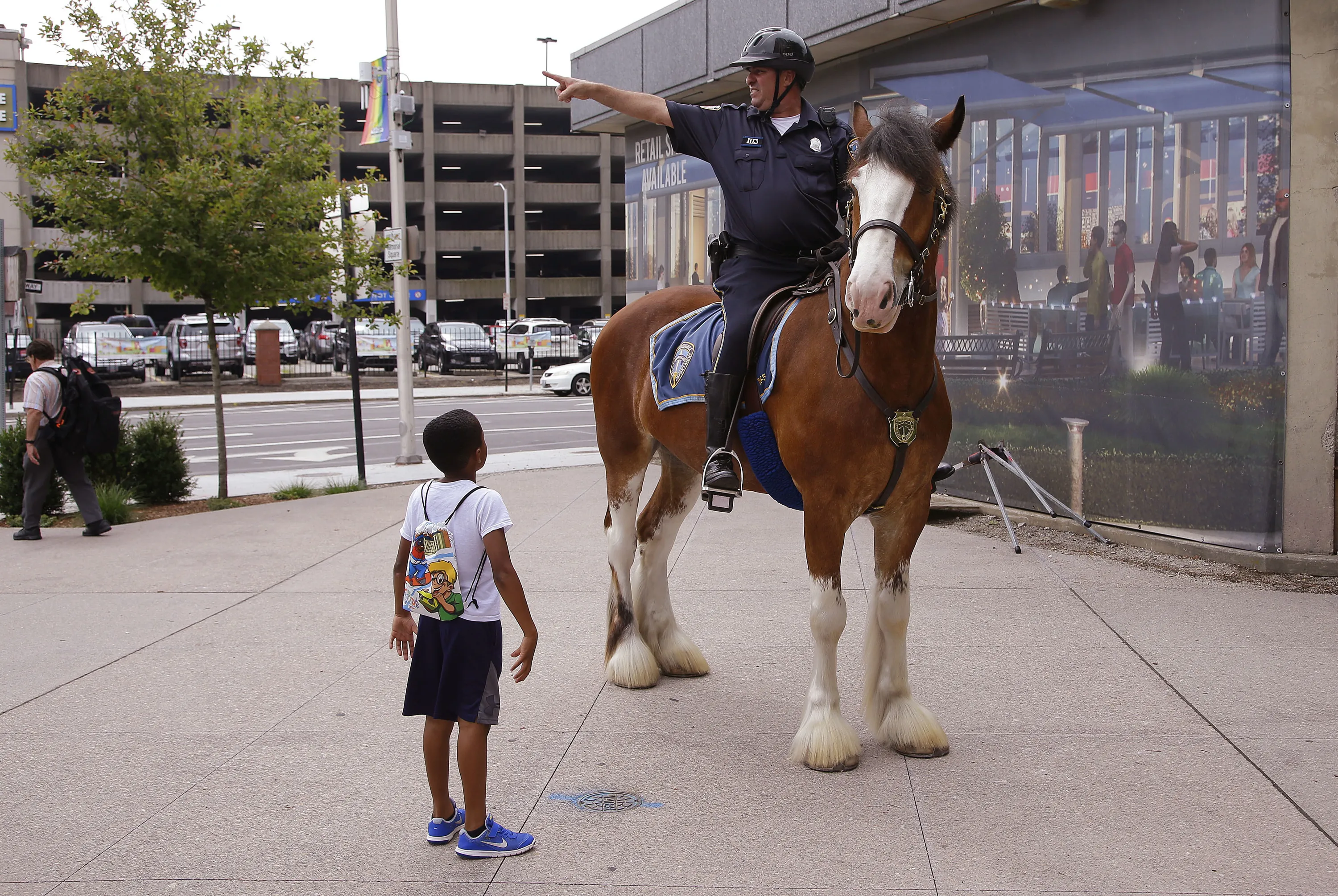 Chaz Samuel, 6, of Virginia, whose mother is attending the National Governor's Association meeting, asks Providence mounted police office Dan Famigliette where the nearest park is that he and his brother can play in accompanied by their nanny during the first day of the National Governor's Association meeting Thursday, July 13, 2017, in Providence, R.I. Officer Famigliette and his Clydesdale “Charlie” are posted along the perimeter of the NGA meeting. (Photo by Stephan Savoia/AP Photo)