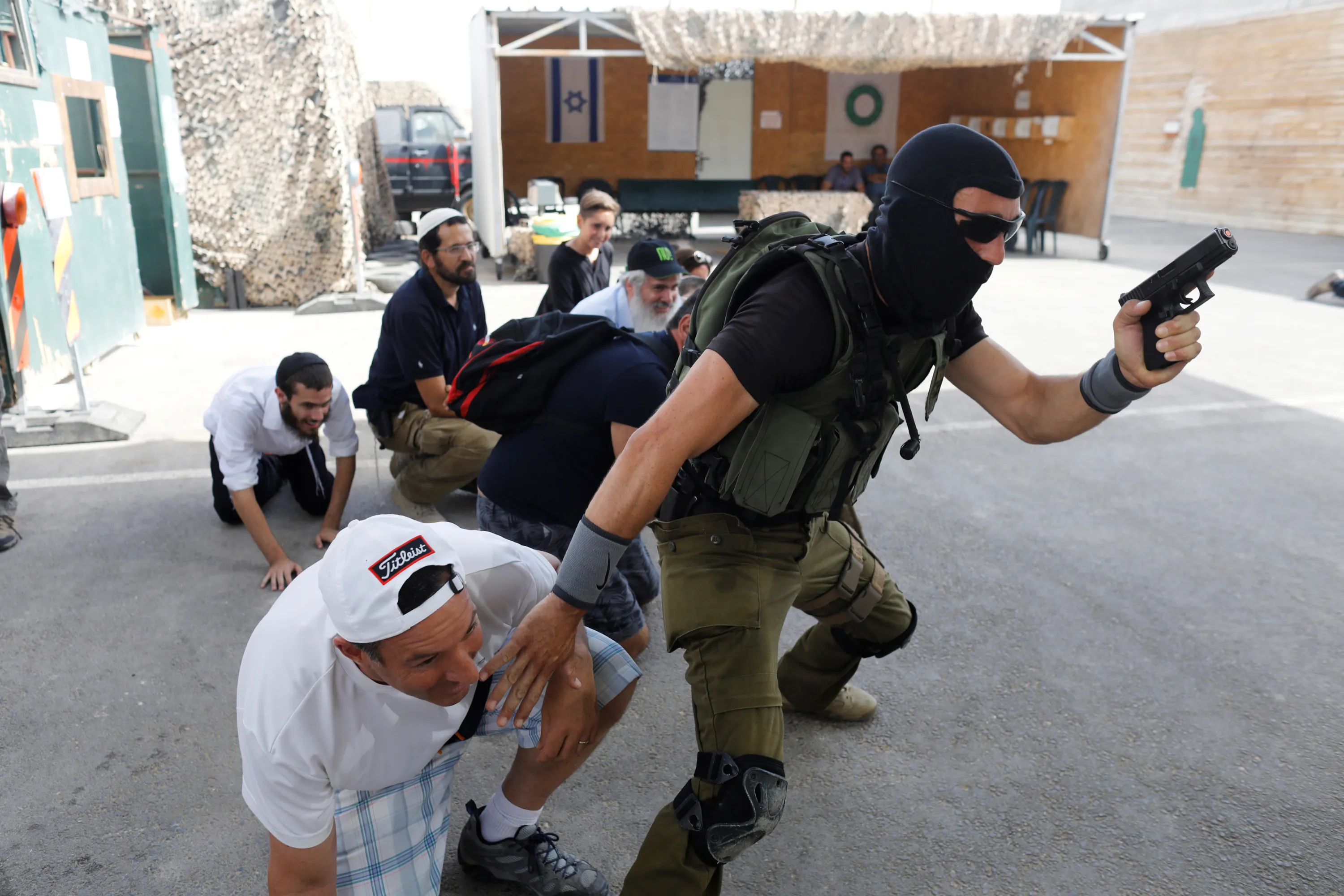 A group of tourists take part in a two hour “boot camp” experience, at “Caliber 3 Israeli Counter Terror and Security Academy” in the Gush Etzion settlement bloc south of Jerusalem in the occupied West Bank on July 13, 2017. It is part of a counter-terrorism “boot camp” organised by Caliber 3, a company set up by a colonel in the Israeli army reserves. (Photo by Nir Elias/Reuters)