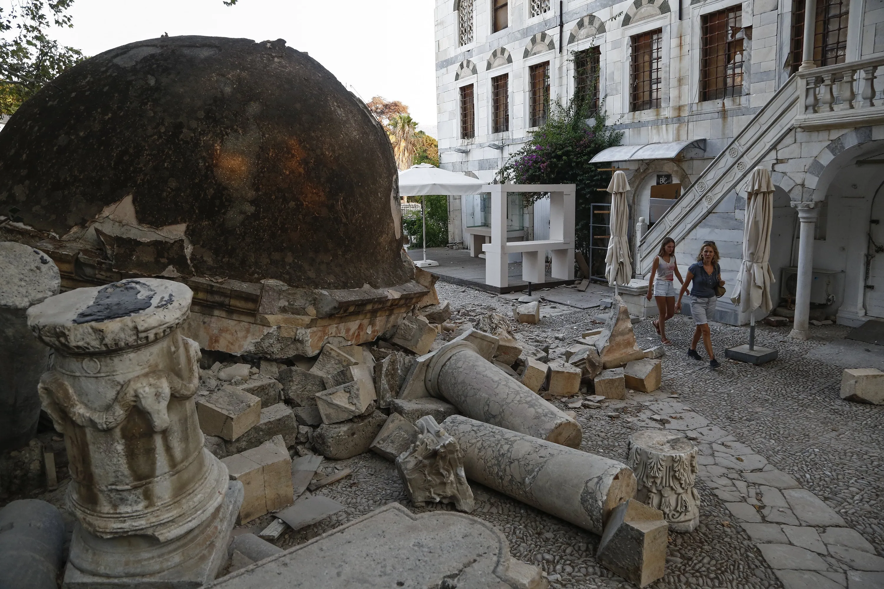 Tourists walk next to a fallen part of a minaret following an earthquake on the island of Kos, Greece, 21 July 2017. Two earthquake-related fatalities were reported on the island of Kos in the early morning hours of 21 July 2017, while several others were injured from a 6.7 magnitude earthquake that shook the island and much of the southeast Aegean region and southwestern Turkey. A 39-year-old Turk and a 27-year-old Swede are reportedly dead, according to sources. Five persons who have been seriously injured were transferred to the Heraklion University Hospital in Crete. Some buildings have suffered serious damage. The island's port has sustained damage while the airport is operating normally. (Photo by Yannis Kolesidis/EPA/EFE)