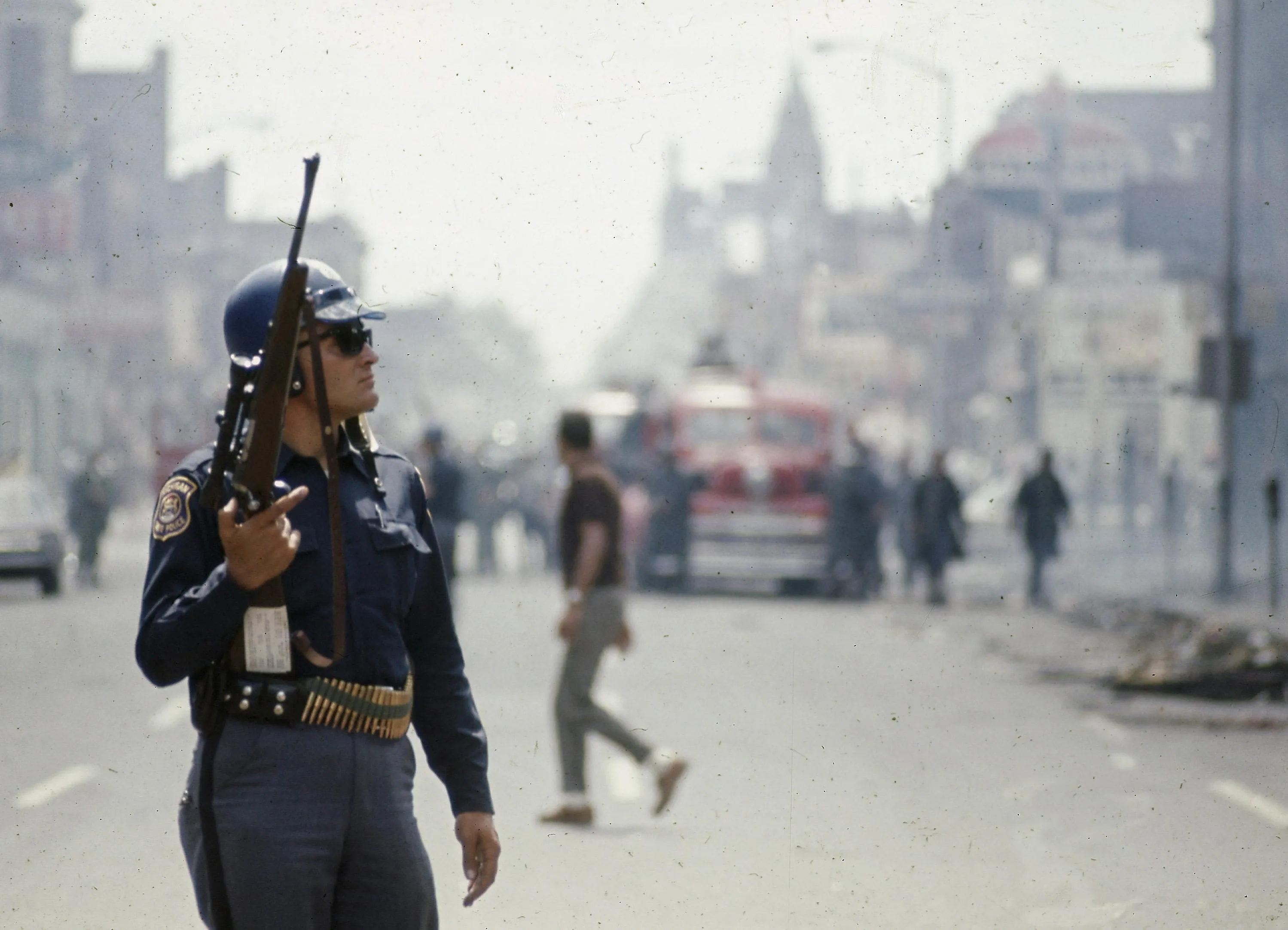 A Detroit police officer with a carbine mounted with a telescopic sight looks toward a roof for snipers in an area of the city wracked by rioting, July 1967. (Photo by AP Photo)