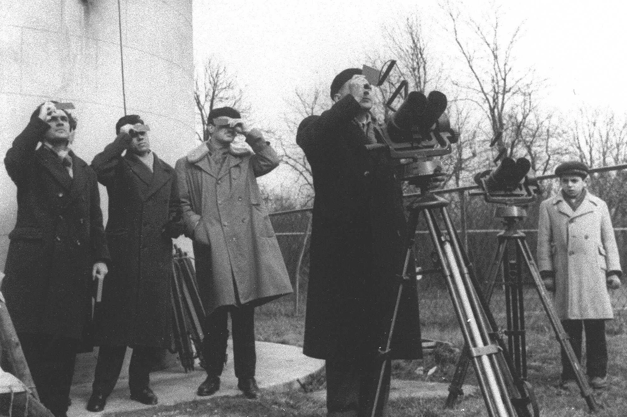 Romanians observe a total eclipse of the sun through smoked pieces of glass in downtown Bucharest February 15, 1961. (Photo by AP Photo/ROMPRES)