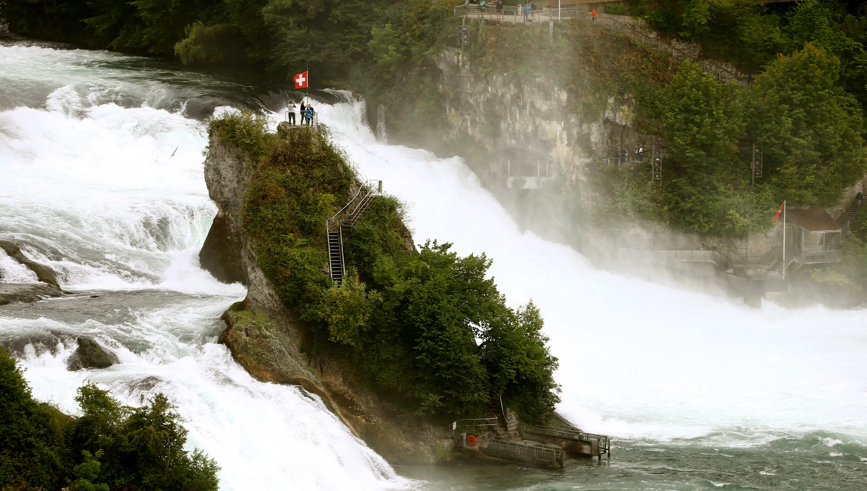 Tourists stand under a Swiss national flag atop an island in between the Rhine Falls, the largest falls in Europe, in the town of Neuhausen, Switzerland July 25, 2017. (Photo by Arnd Wiegmann/Reuters)