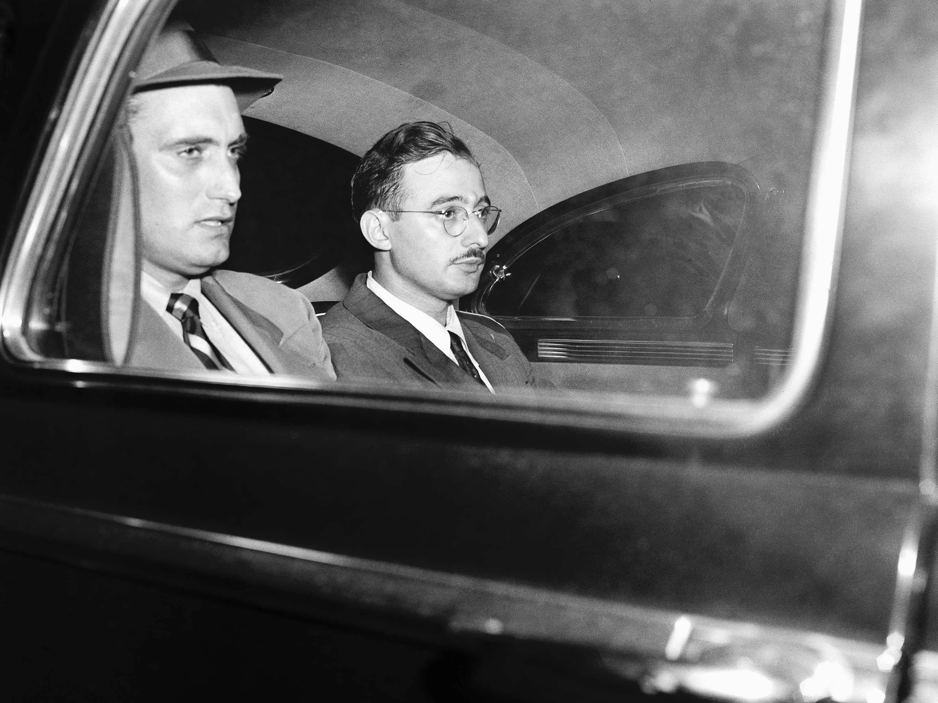Julius Rosenberg, right, American-born engineer and New York manufacturer, sits in auto with FBI man enroute to federal house of detention in New York City, after his arraignment, July 17, 1950 on charges of conspiring to commit espionage. He is held in $100,000 bail. He was arrested earlier in day by the FBI and accused of recruiting for a Russian-financed atom bomb spy ring. (Photo by Tom Fitzsimmons/AP Photo)