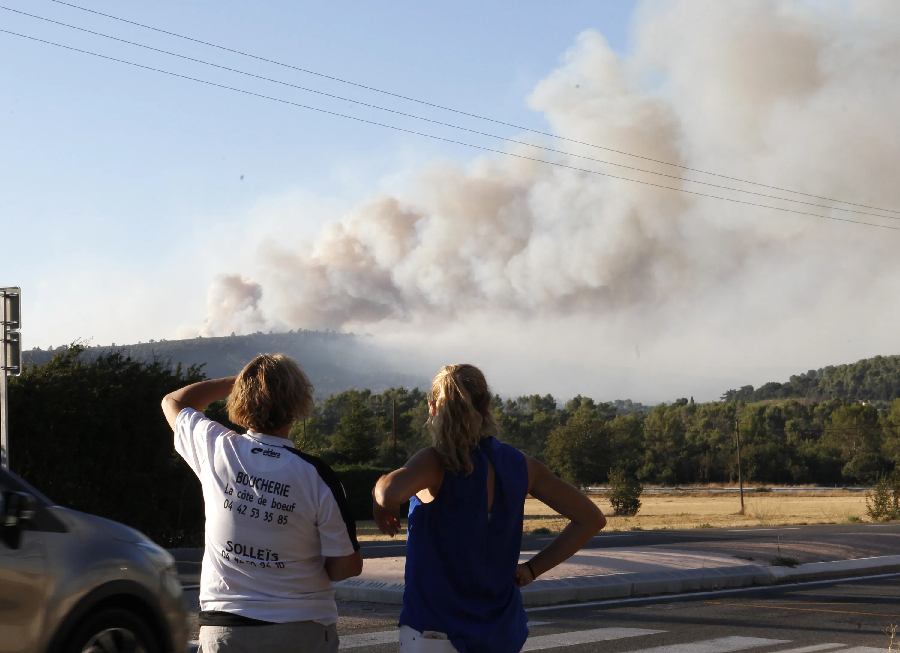 People kook at a forest fire near Seillons-Source- d'Argent, southern France, Tuesday, July 25, 2017. Hundreds of firefighters are battling blazes fanned by high winds in more than a dozen zones in the Riviera region of southern France. (Photo by Claude Paris/AP Photo)