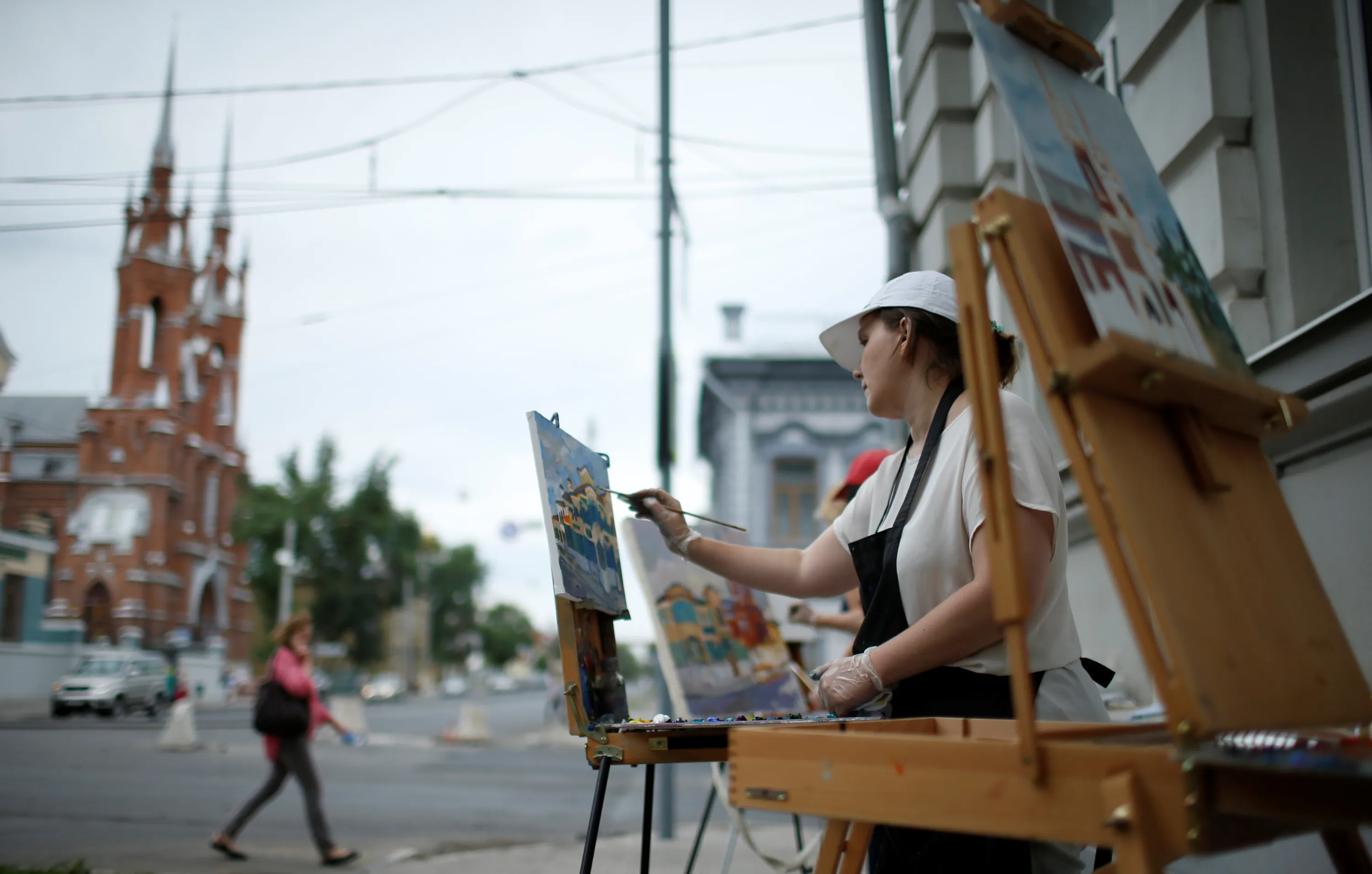 Women paint on a street in Samara, Russia on July 18, 2017. (Photo by David Mdzinarishvili/Reuters)