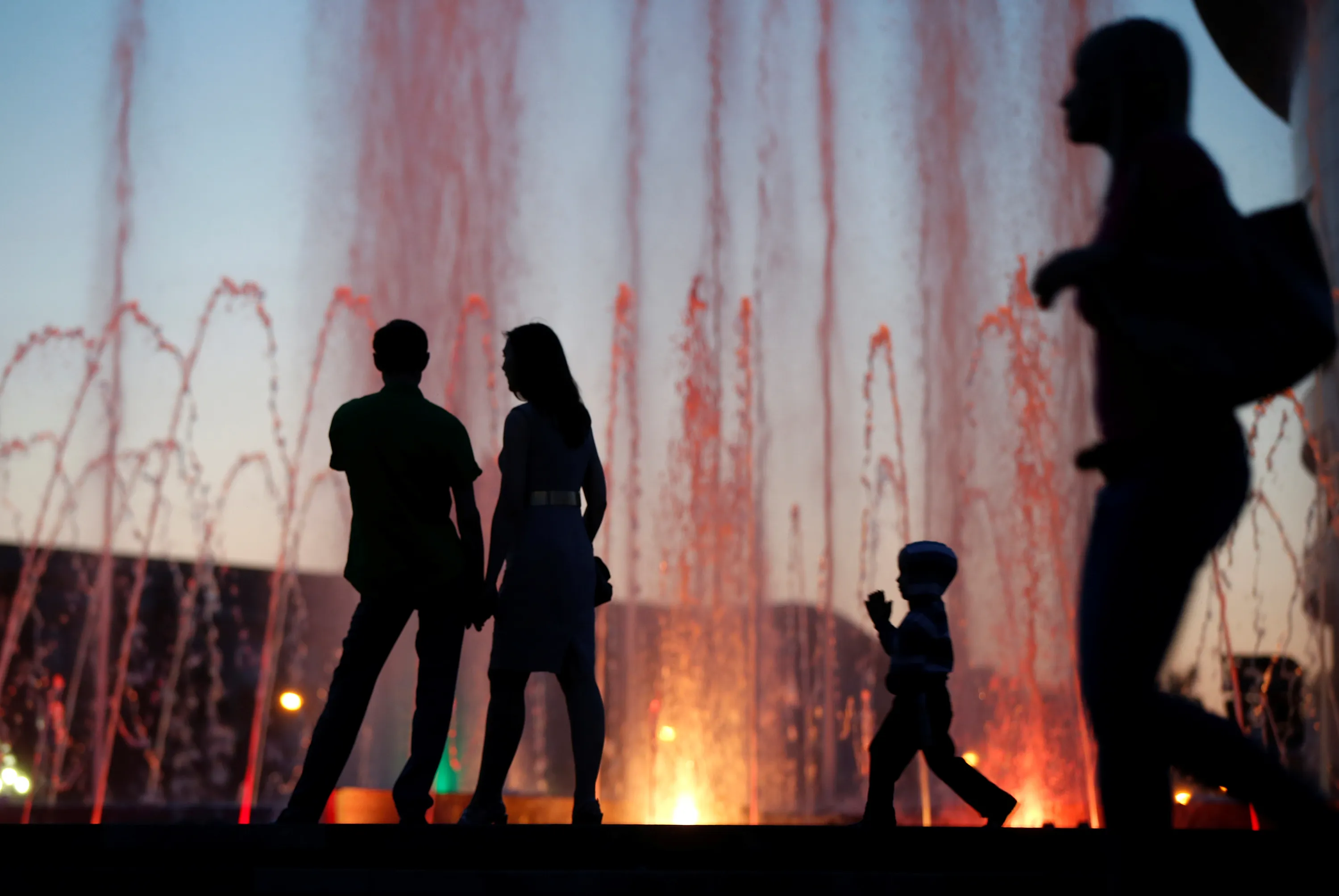People are silhouetted in front of a musical fountain at the Millennium Square in Saransk, Russia on July 15, 2017. (Photo by David Mdzinarishvili/Reuters)