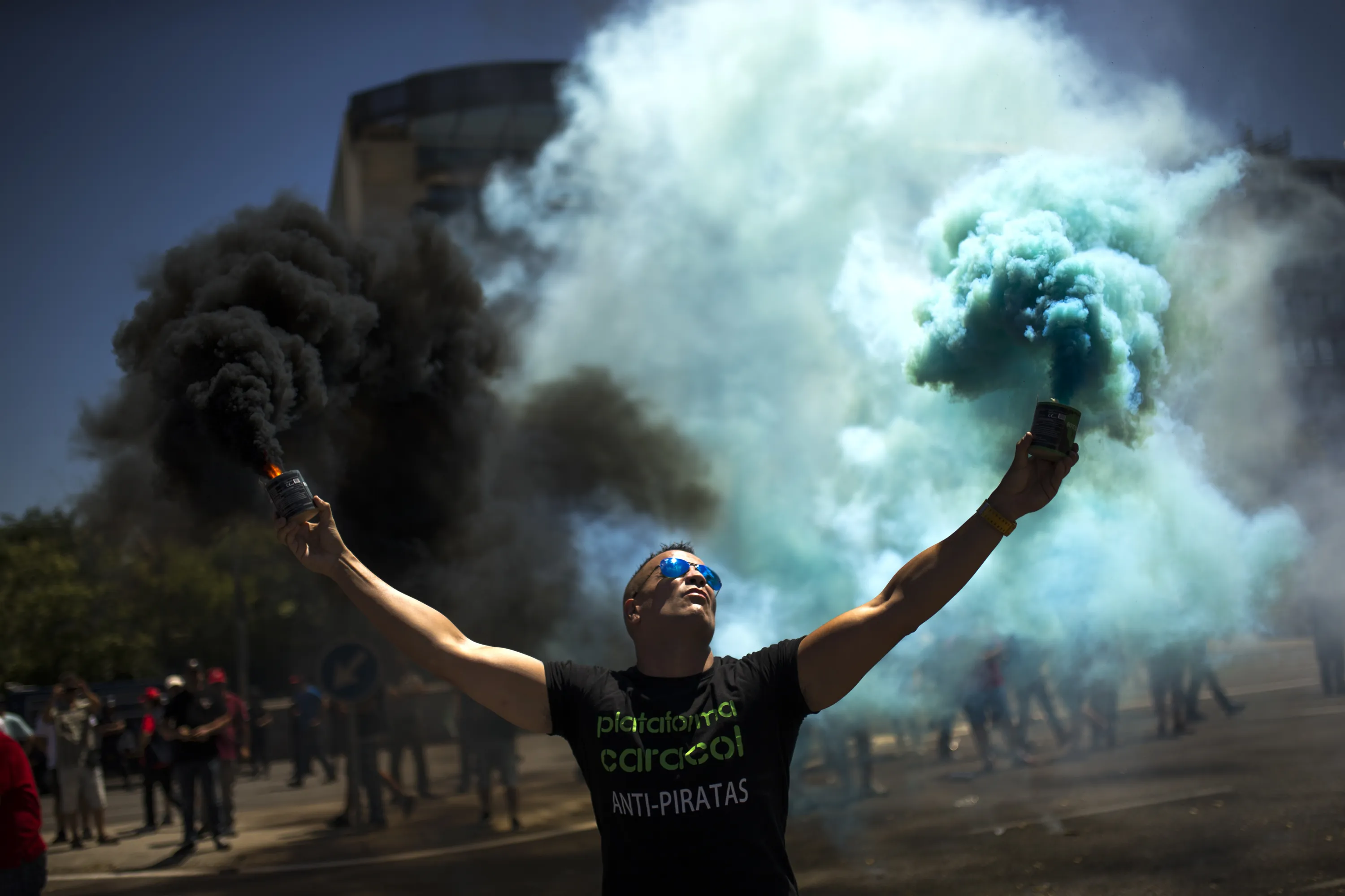 A man holds smoke bombs during a protest by Spanish taxi drivers unions in Madrid, Thursday, July 27, 2017. Taxi drivers unions called for a 24-hours strike to protest the increase in cars run by private companies offering cheaper, mobile ride-hailing services. (Photo by Francisco Seco/AP Photo)