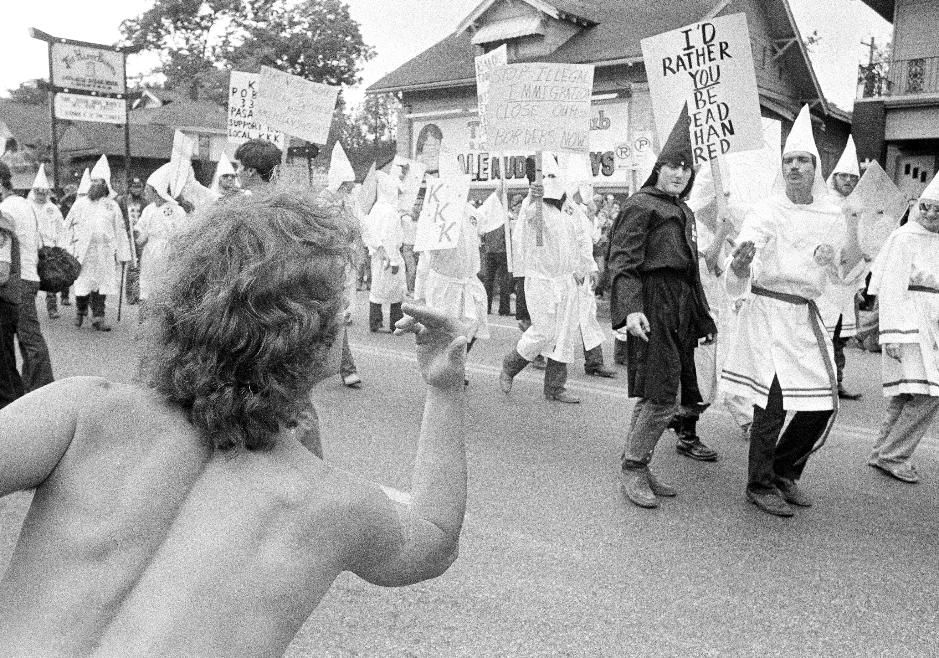 A spectator gestures to the Ku Klux Klan marchers as the KKK paraded through the heart of Houston�s gay community Saturday, June 9, 1984. About 55 members of the Klan marched under the protection of hundreds of policemen. There was a lot of shouting between the opponents, but no clashes. (Photo by AP Photo/RC)