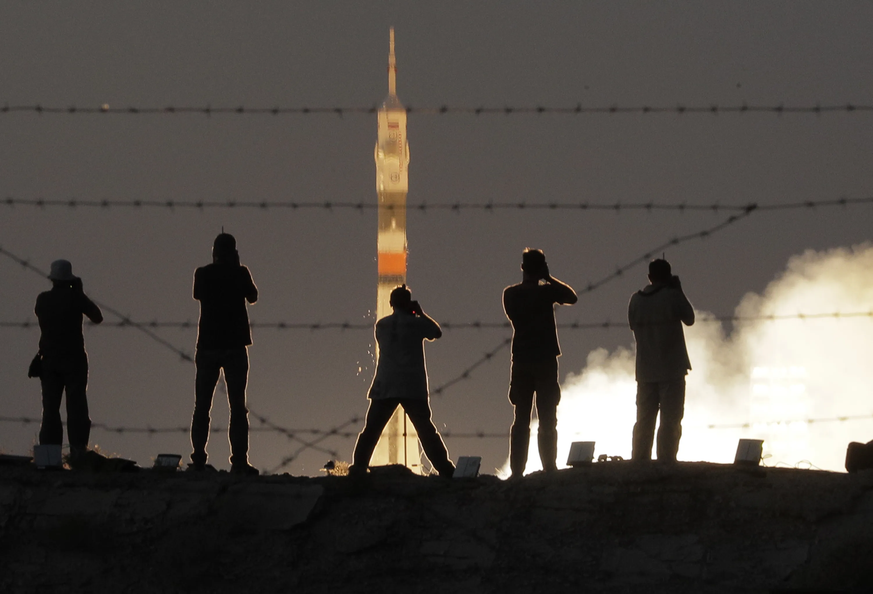 Photographers take photos of the Soyuz-FG rocket booster with Soyuz MS-05 space ship carrying a new crew to the International Space Station, ISS, blasting off at the Russian leased Baikonur cosmodrome, Kazakhstan, Friday, July 28, 2017. The Russian rocket carries U.S. astronaut Randy Bresnik, Russian cosmonaut Sergey Ryazanskiy and Italian astronaut Paolo Nespoli. (Photo by Dmitri Lovetsky/AP Photo)