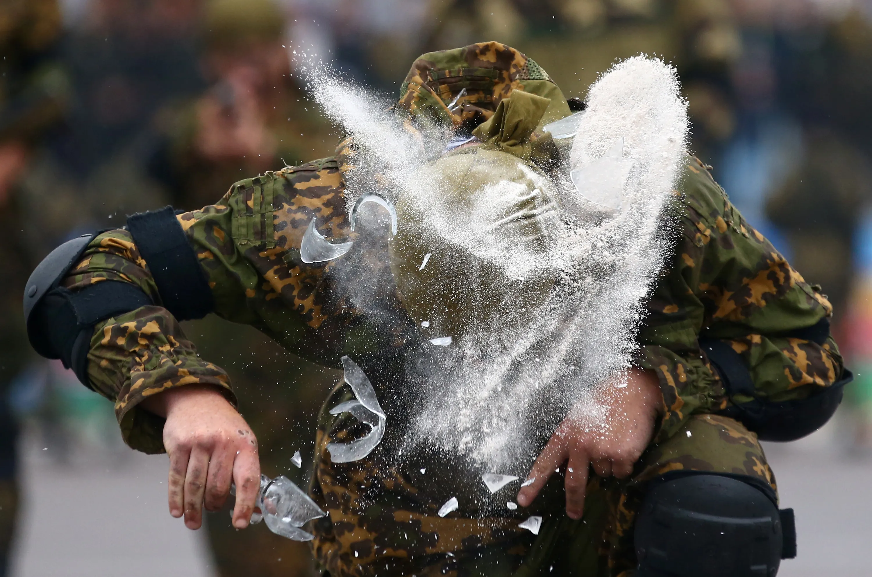 Belarusian paratroopers perform during the celebration of the Day of the Paratrooper, which is celebrated in Belarus on August 2, in Minsk, Belarus July 29, 2017. (Photo by Vasily Fedosenko/Reuters)