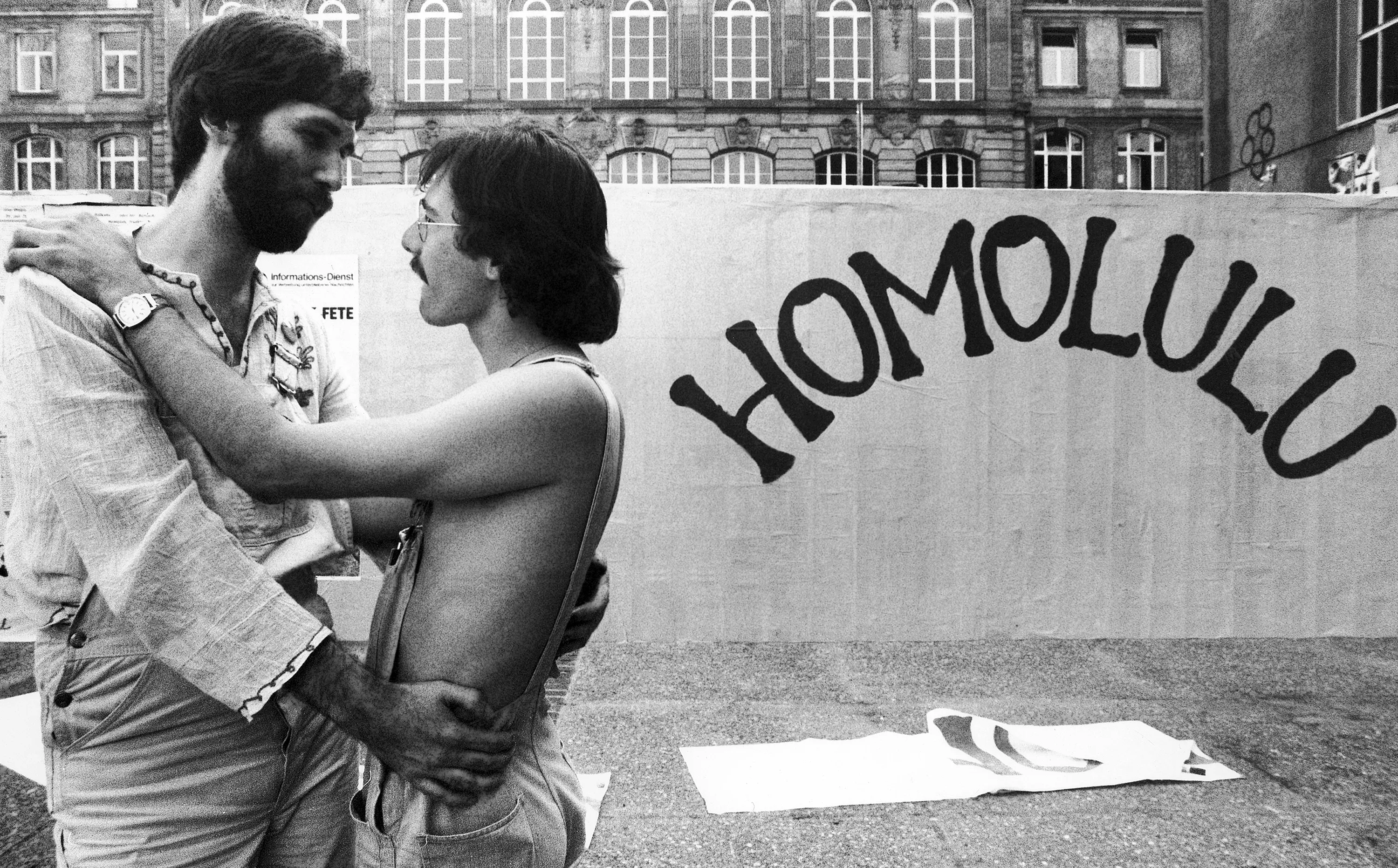 Two unidentified gay men embrace next to a banner reading “Homolulu” during a homosexual meeting at the campus of the Johann Wolfgang Goethe University in Frankfurt, Germany on July 26, 1979. The organizers are expecting more then 3.000 participants from Europe and prepare for a demonstration through the city. (Photo by Rolf Boehm/AP Photo)