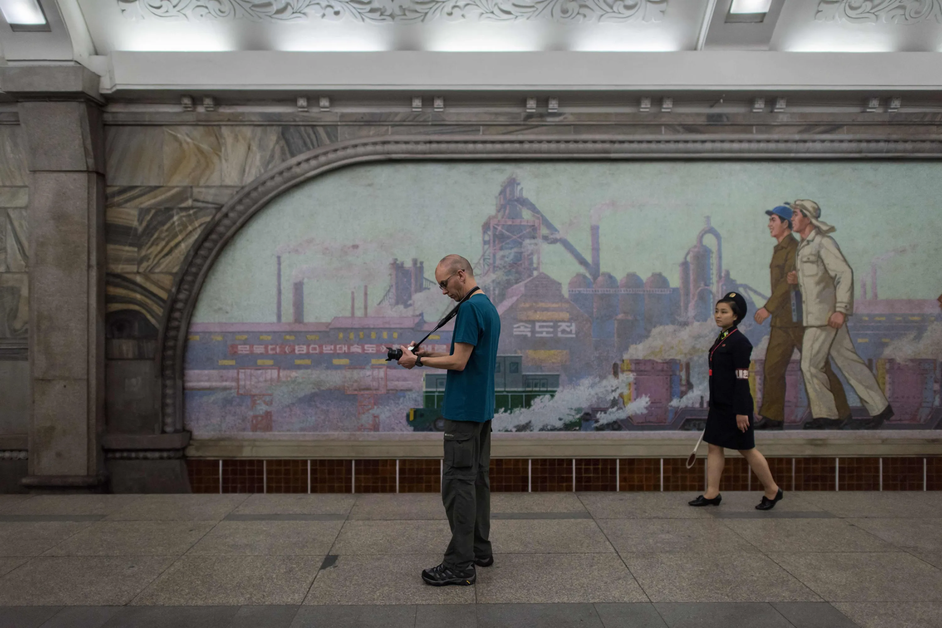 A tourist takes a photo during a visit to a subway station in Pyongyang on July 23, 2017. The Westerners lined up before giant statues of North Korea’s founder Kim Il- Sung and his son and successor Kim Jong- Il on Sunday and, on command from their guide, bowed deeply - a ritual that the Trump administration intends to stop US tourists performing, with Washington due to impose a ban on its citizens holidaying in the Democratic People' s Republic of Korea (DPRK), as the North is officially known. (Photo by Ed Jones/AFP Photo)