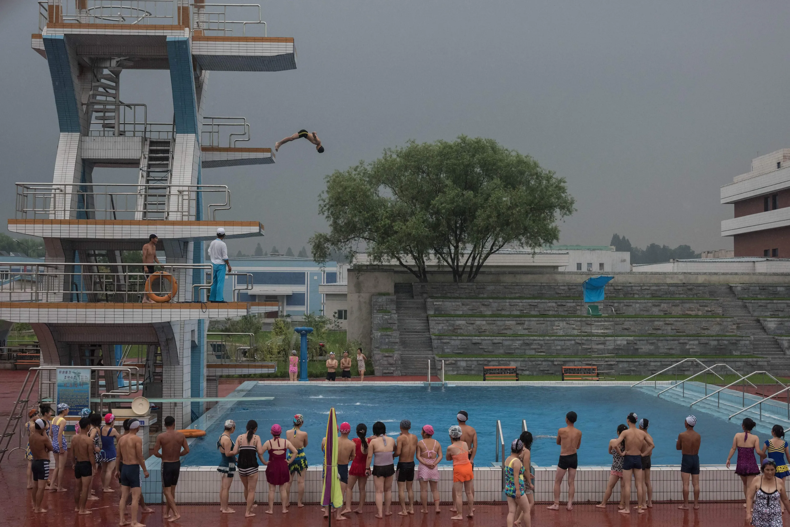 Swimmers watch as a man performs a dive from a platform at a water park in a leisure complex in Pyongyang on July 21, 2017. (Photo by Ed Jones/AFP Photo)