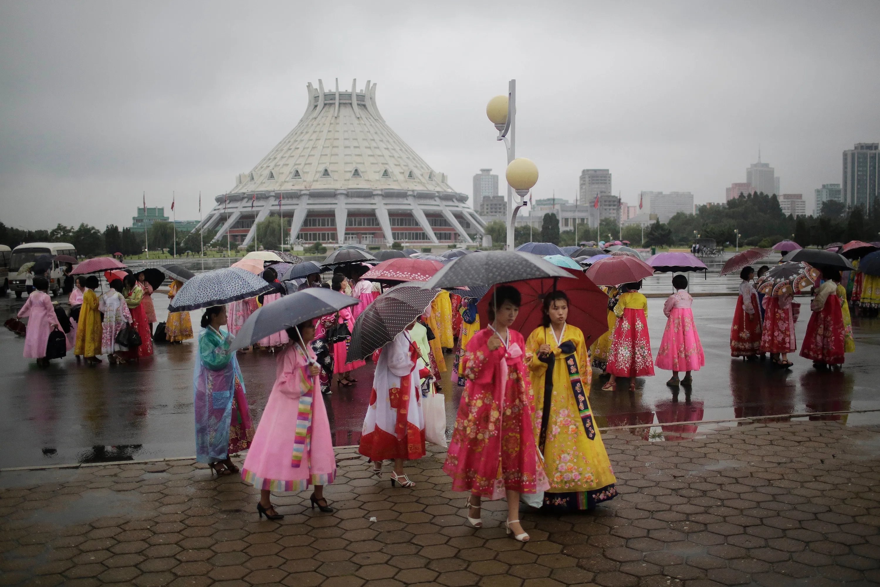 University students wearing traditional Korean dresses wait in the rain for the start of a mass dance on Thursday, July 27, 2017, in Pyongyang, North Korea as part of celebrations for the 64th anniversary of the armistice that ended the Korean War. (Photo by Wong Maye-E/AP Photo)