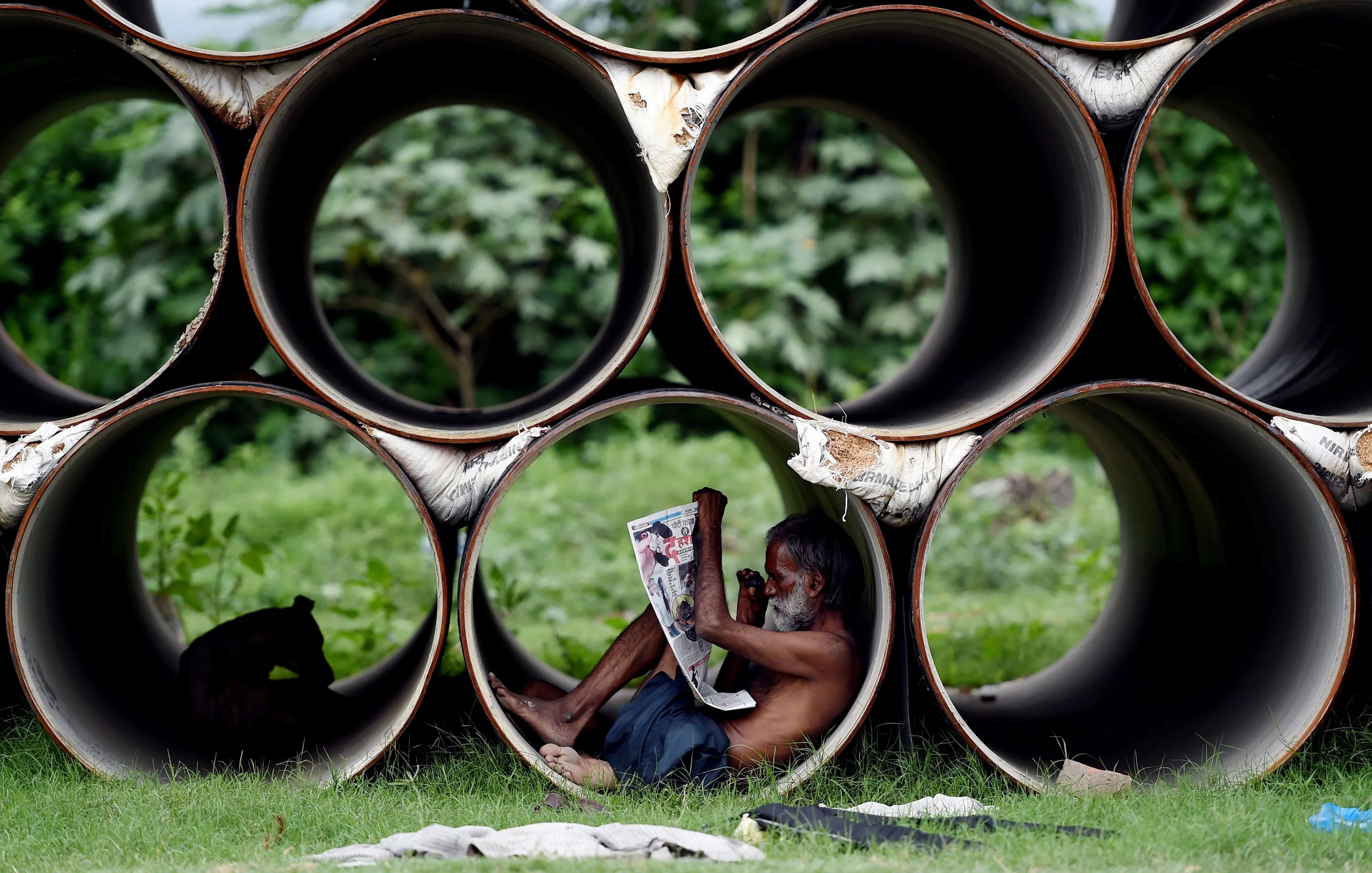 An Indian man reads a newspaper as he sits inside a pipe in New Delhi on August 2, 2017. (Photo by Money Sharma/AFP Photo)