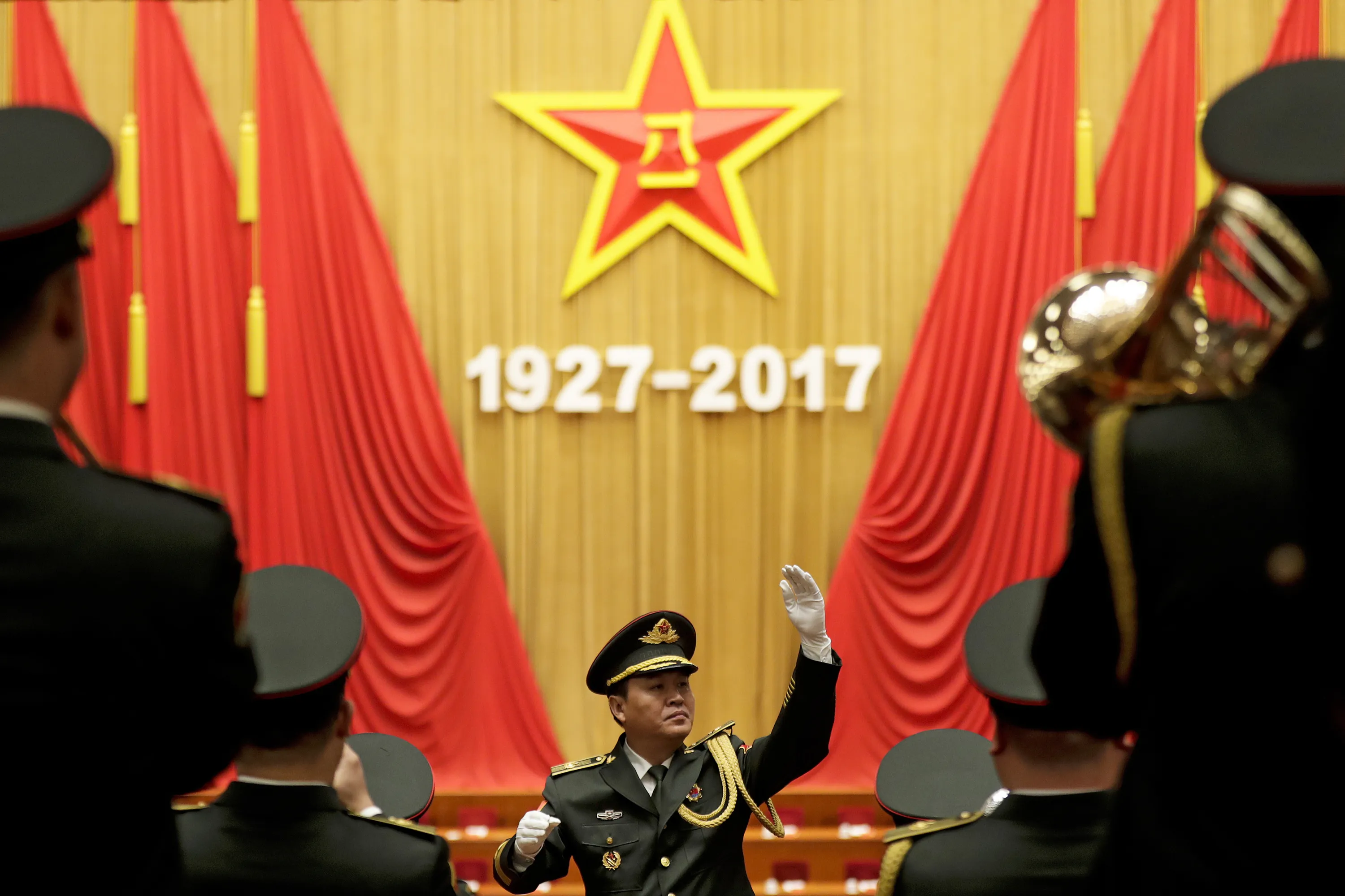 A military band conductor rehearses ahead a ceremony to commemorate the 90th anniversary of the founding of the People's Liberation Army at the Great Hall of the People in Beijing, Tuesday, August 1, 2017. China's President Xi Jinping has issued a tough line on national sovereignty amid multiple disputes with his country’s neighbors, saying China will never permit any loss of territory. Xi’s declaration came during a nearly one-hour speech Tuesday in Beijing marking the 90th anniversary of the founding of the People’s Liberation Army. (Photo by Andy Wong/AP Photo)